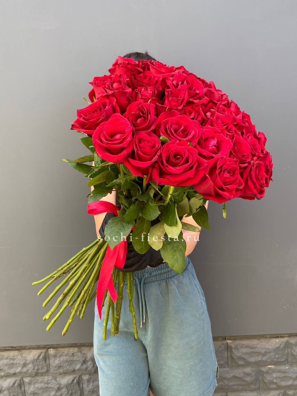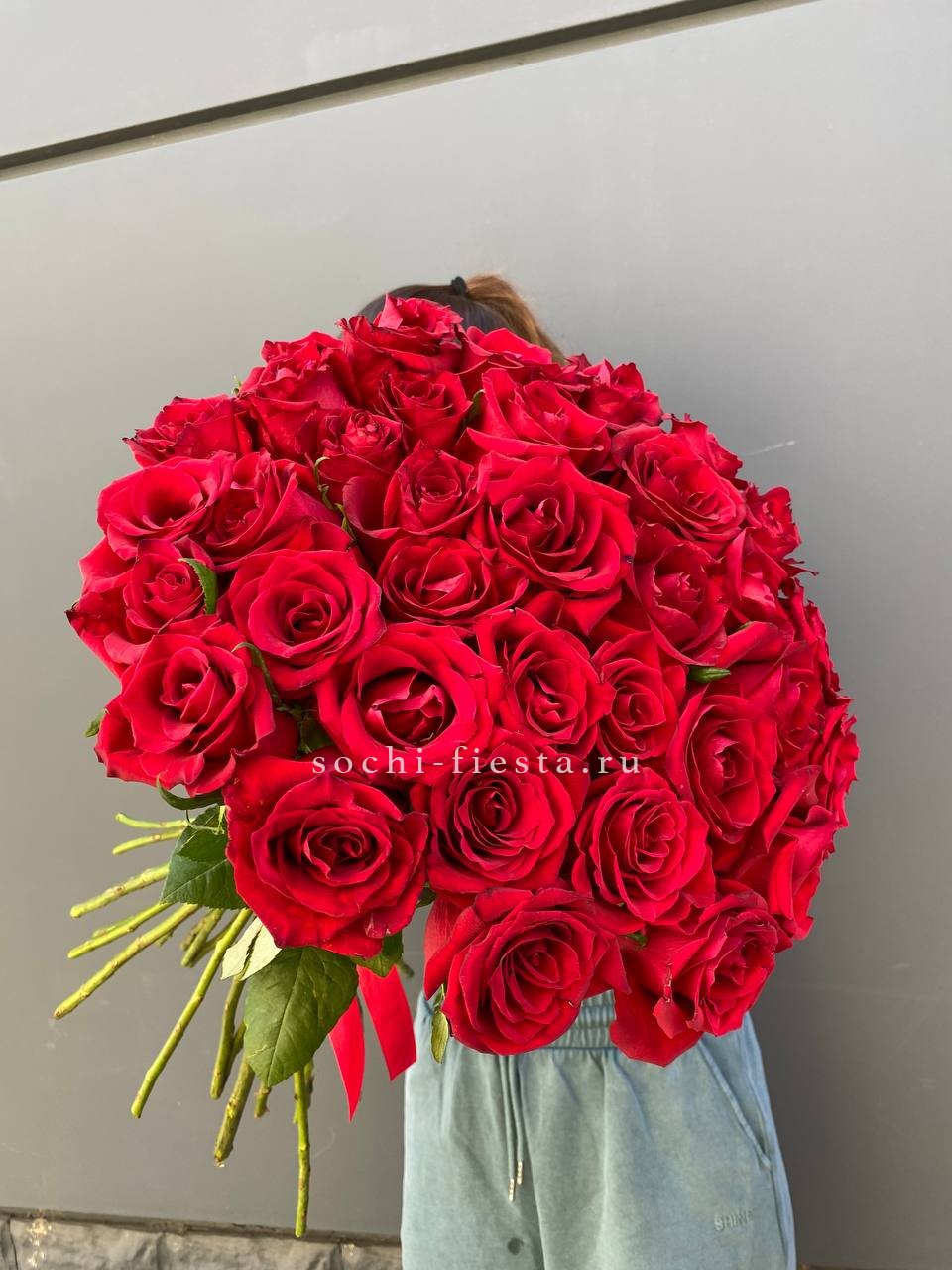 Сто один бутон образует плотную красную сферу с безупречной геометрией. Кенийская роза отличается густотой лепестков и насыщенным оттенком который не теряет глубину даже при ярком свете. Букет держит форму и впечатляет масштабом.