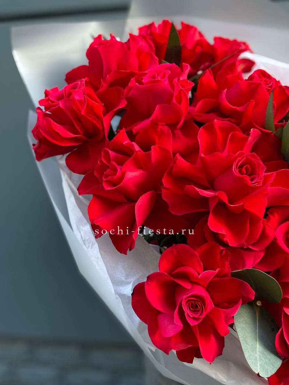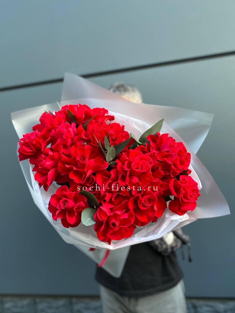 Семь вывернутых роз раскрывают лепестки наружу и создают объемную текстуру. Эвкалипт обрамляет бутоны и придает композиции свежесть.