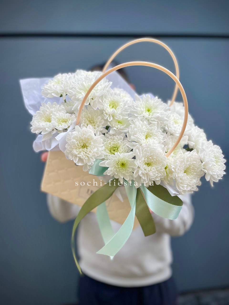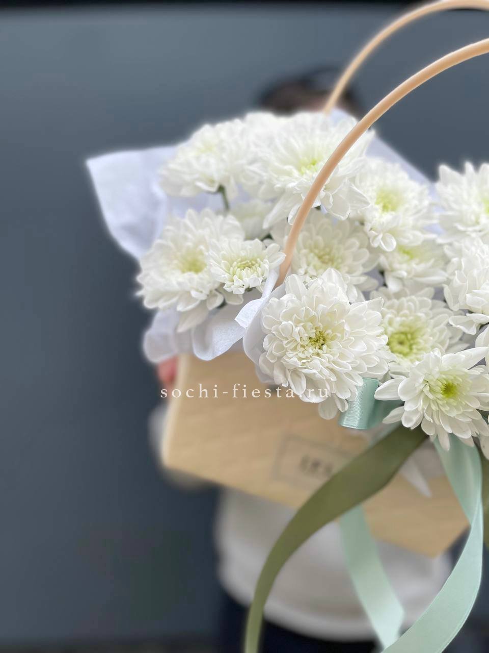 Пять веток кустовой хризантемы собраны в компактную форму с чёткими линиями. Лаконичная упаковка и лента сохраняют естественный объём соцветий. Букет выглядит собранно и свежо.