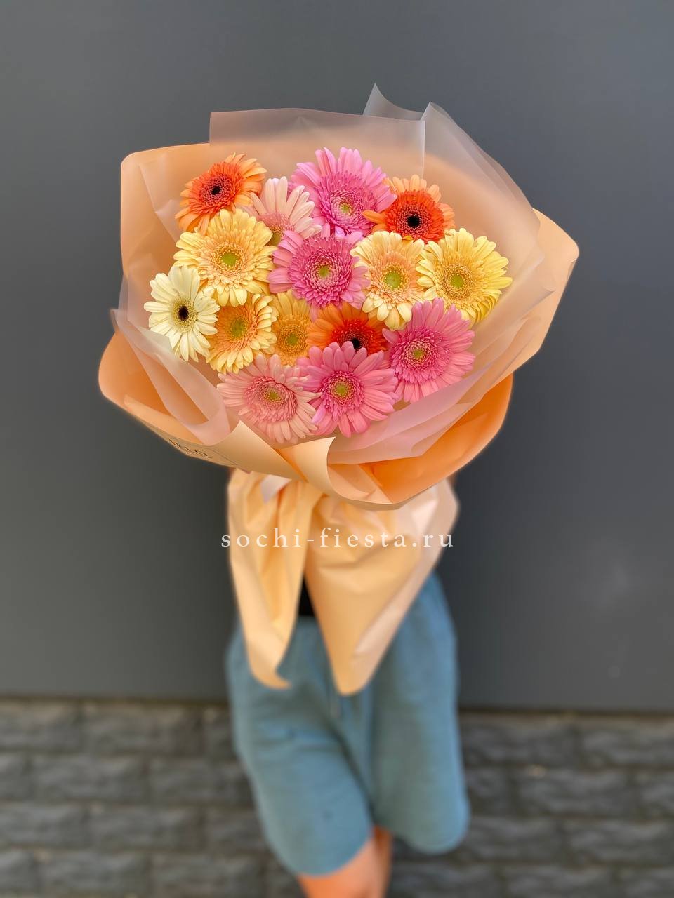 Пятнадцать гербер собраны в плотную округлую форму, где каждый цветок раскрыт навстречу свету. Яркая палитра создаёт ощущение летнего дня, застывшего в лепестках.