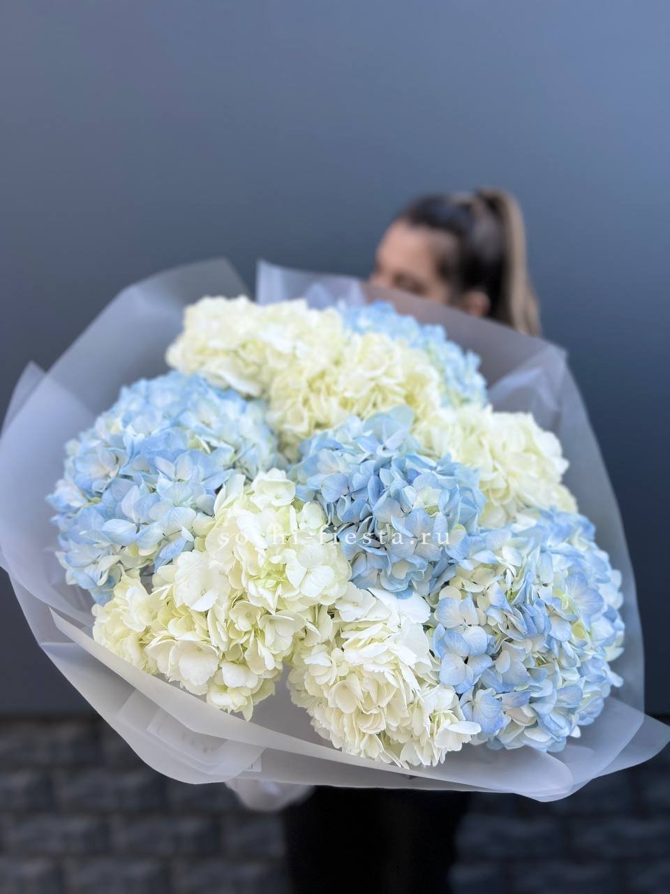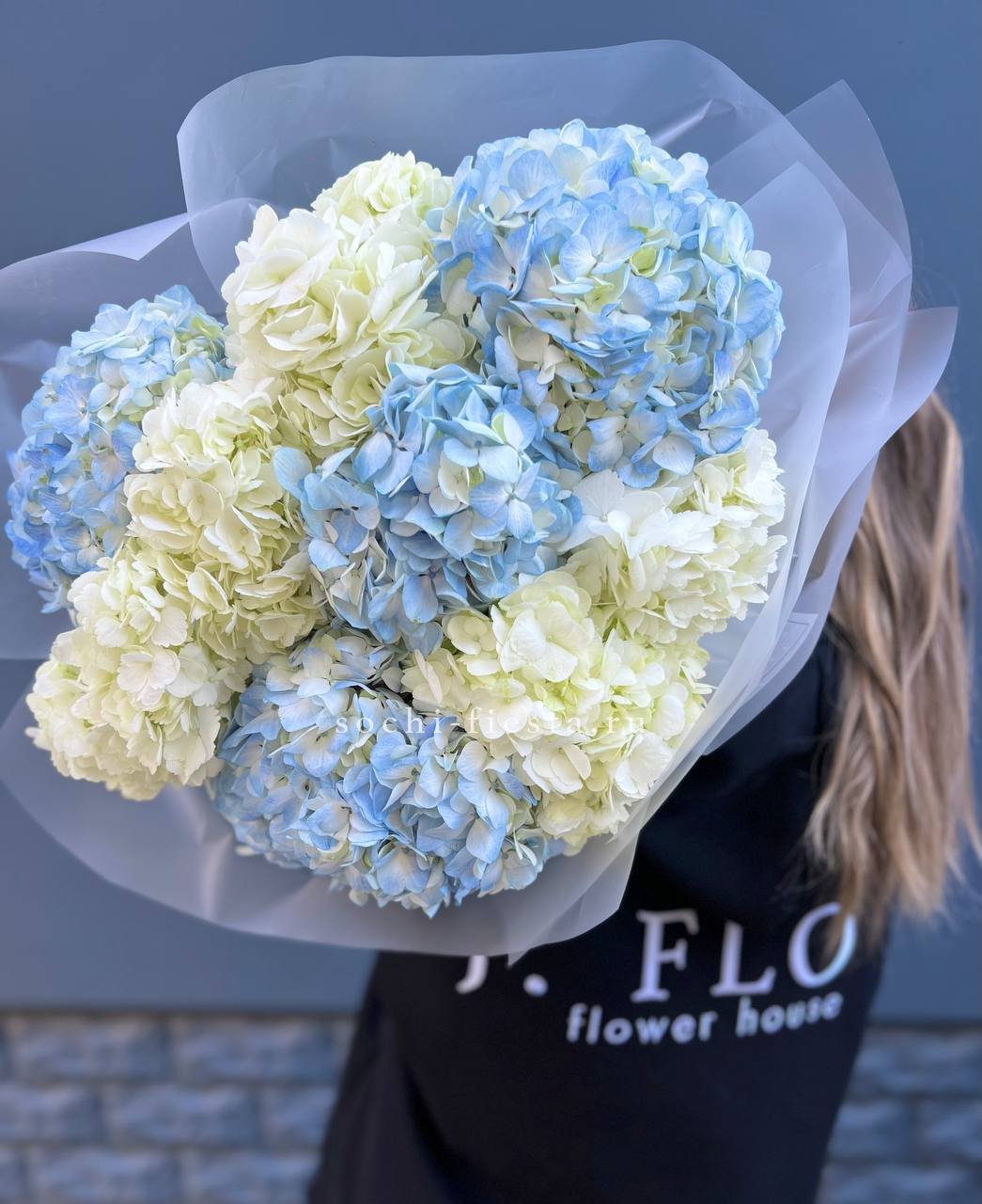 Пышные бутоны Сара Бернар раскрываются среди лепестков роз и воздушной гортензии. Эустома добавляет графичности, а эвкалипт собирает композицию в единый силуэт. Цветовая гамма плавно перетекает от розового к голубому.