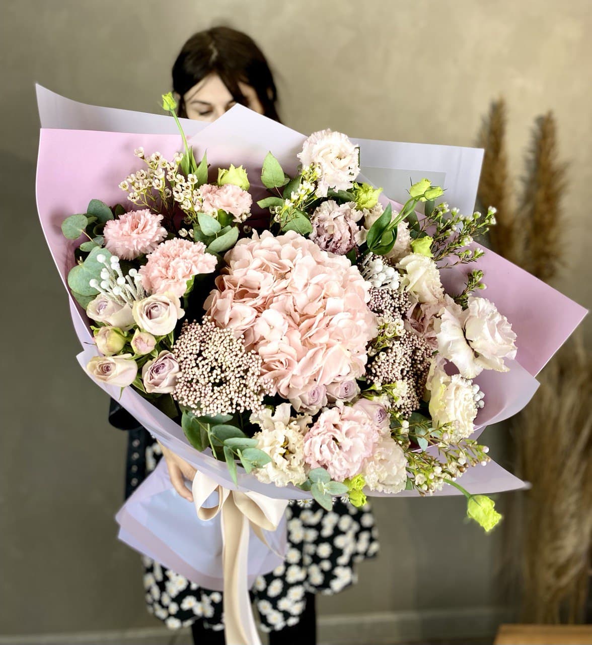 Розовая гамма раскрывается через махровые пионовидные бутоны и классические розы с плотной текстурой лепестков. Эвкалипт вплетается в композицию, создавая свежий акцент.