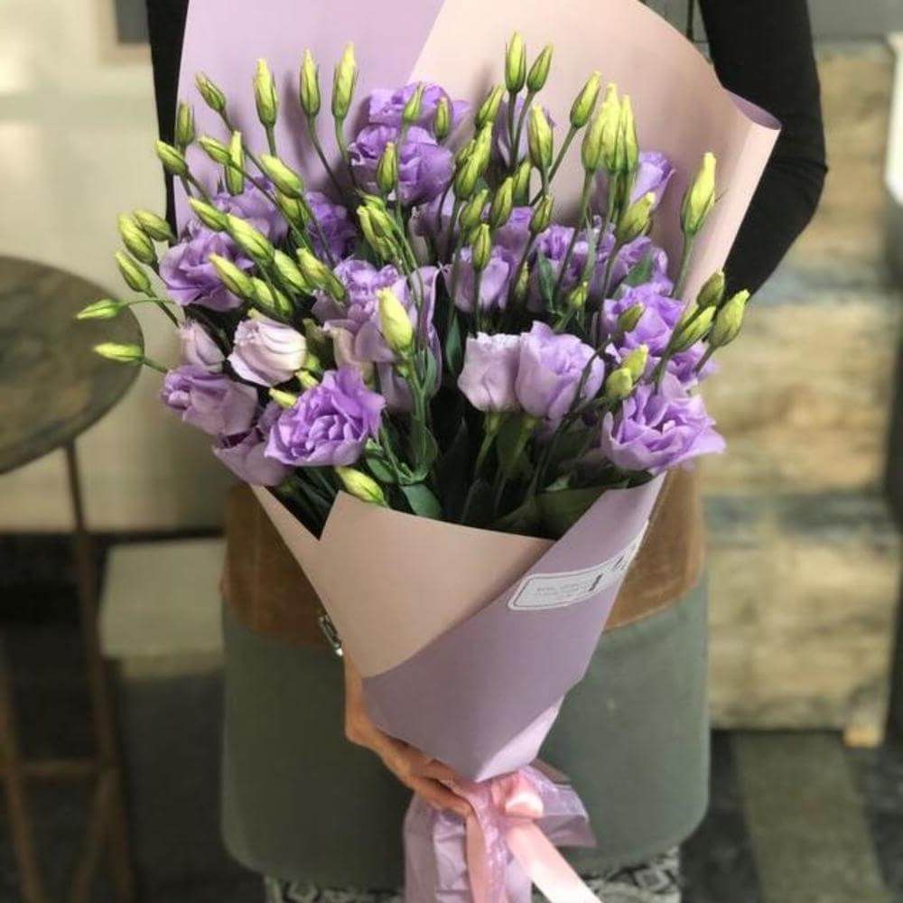 Охапка эустомы в свободной упаковке – чистая форма без усложнений. Веточки располагаются свободно, создавая лёгкий ритм и воздушное присутствие. Монобукет для современного интерьера и минималистичной эстетики.