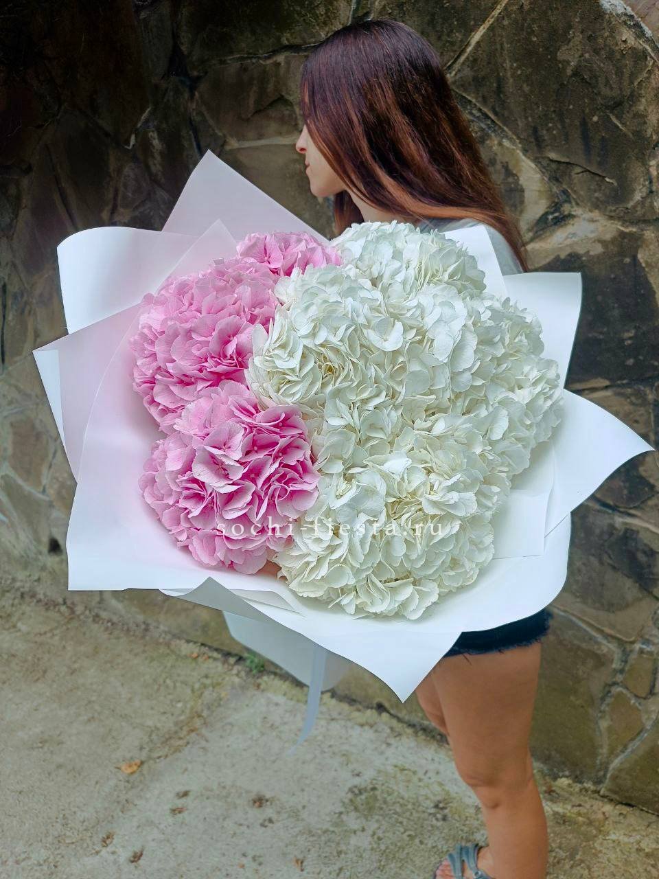 гортензия, герберы, розы французские, эустомы, эвкалипт, оазис, шляпная коробка, пленка, лента.