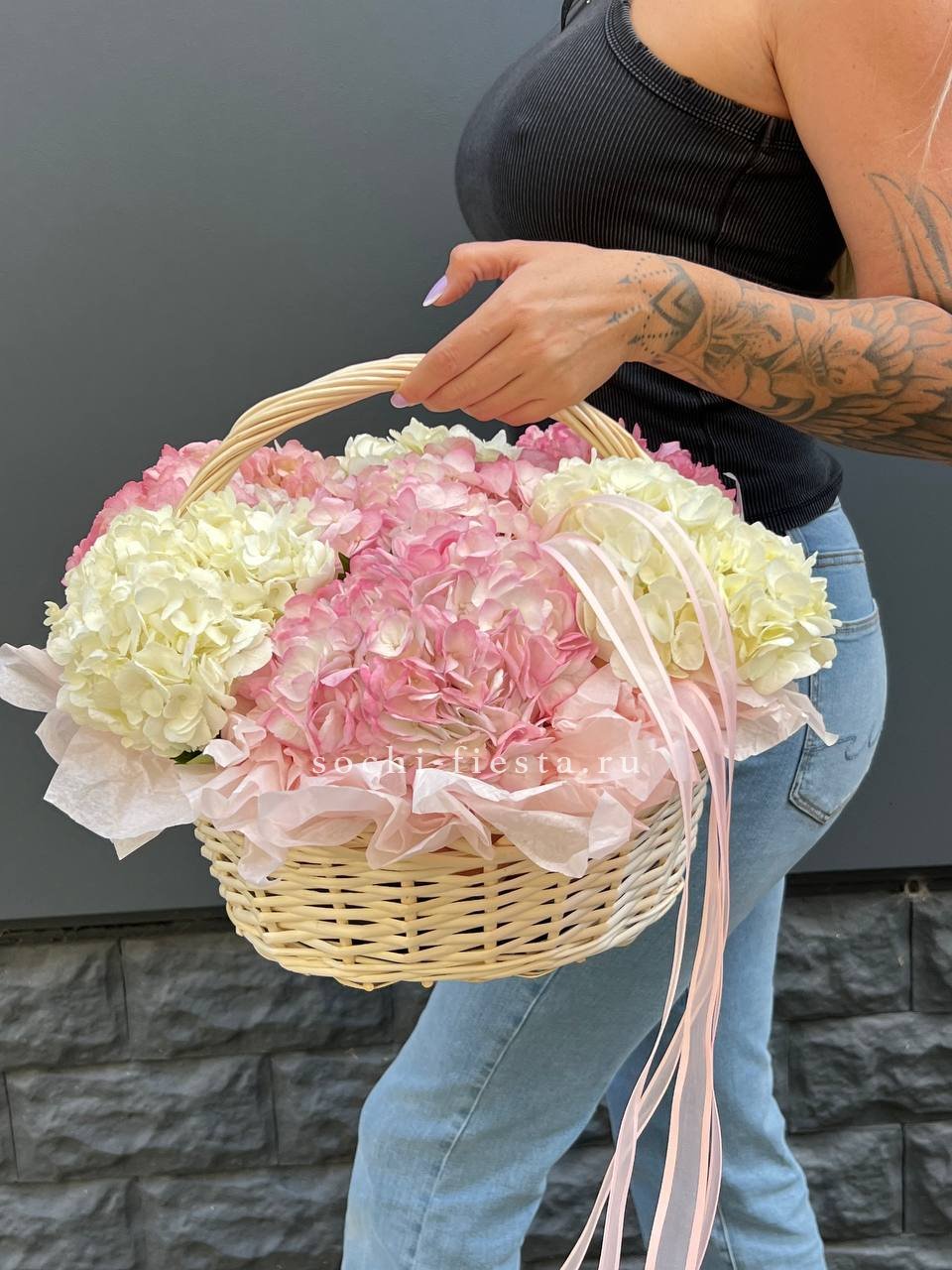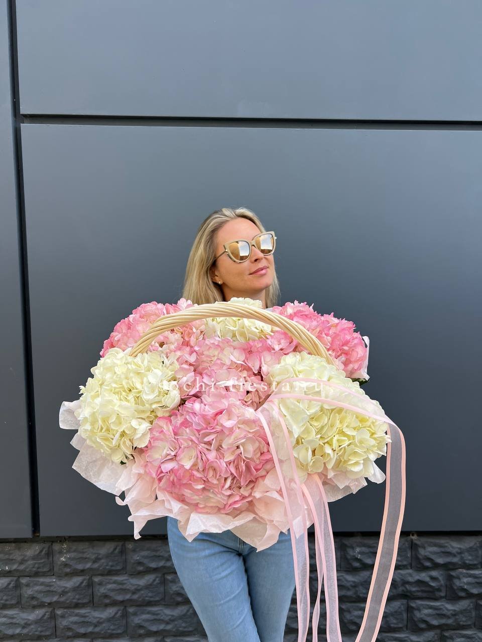 Двадцать пять соцветий гортензий разных оттенков формируют пышное облако с естественной игрой цвета. Каждая головка раскрывается по-своему, создавая живую фактуру без четких границ между тонами.