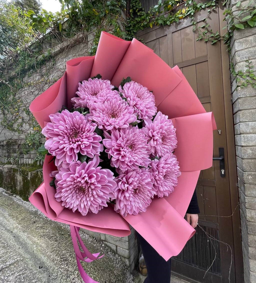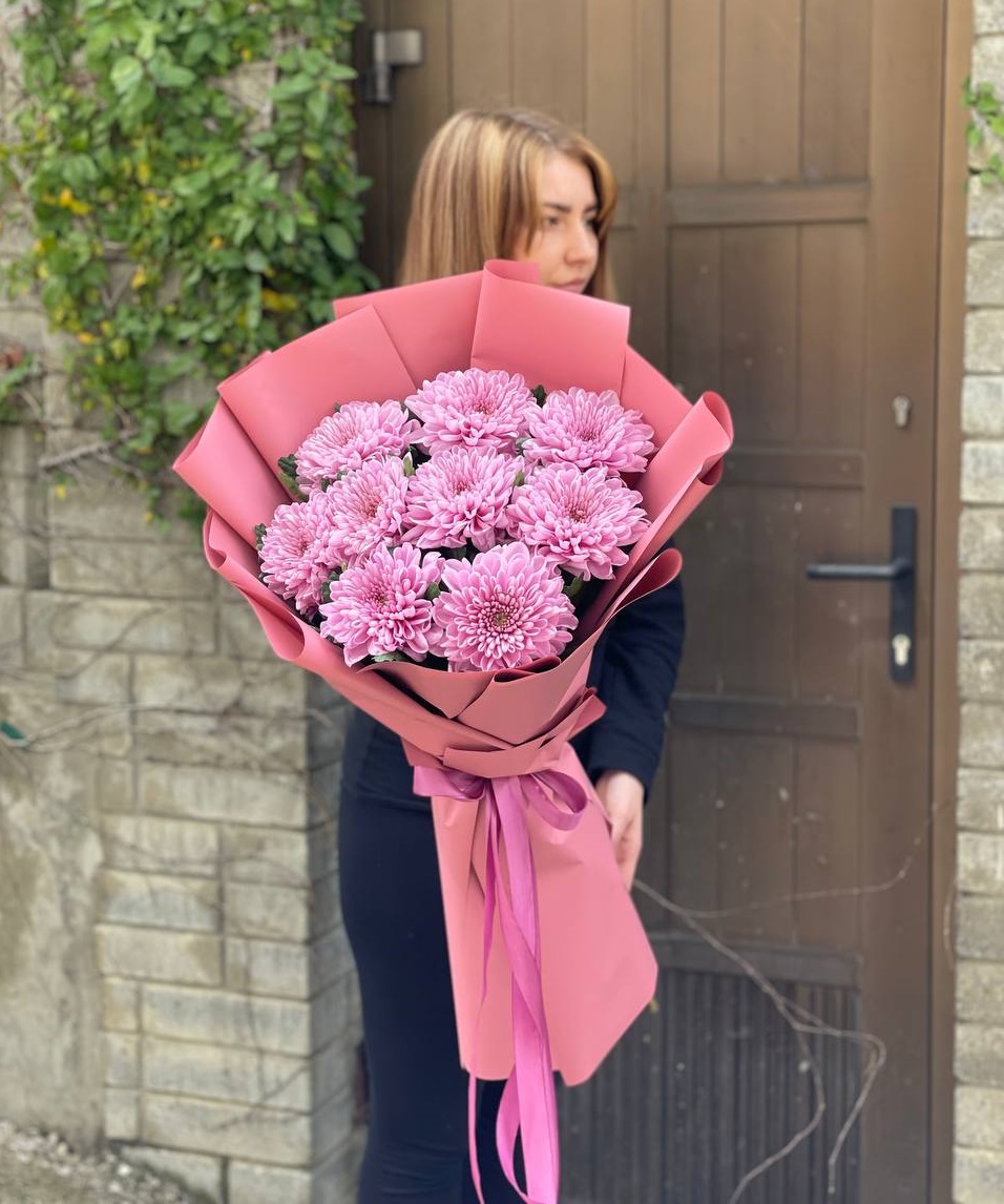 Пять веток кустовой хризантемы с множеством соцветий создают пышную воздушную массу. Букет напоминает утренний сад, где каждая ветка живёт своим ритмом и дарит ощущение лёгкости.