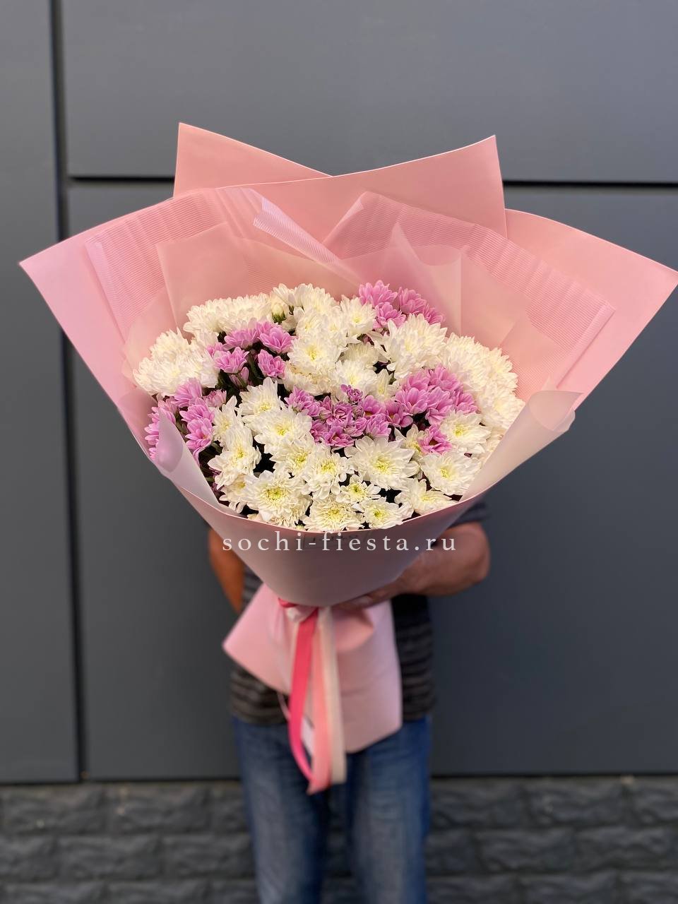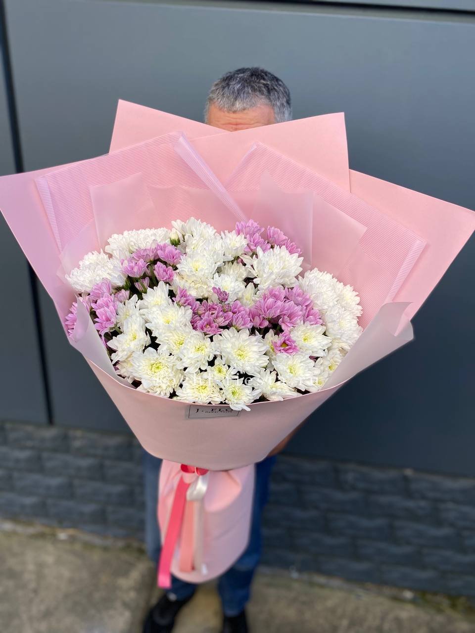 Крупные соцветия одноголовых хризантем раскрываются во всей полноте. Плотные лепестки образуют графичные круги, а сдержанная упаковка сохраняет чистоту формы.