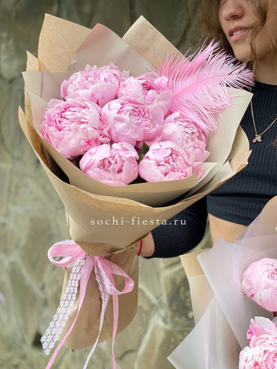 7 розовых пионов сорта Сара бернар, лента, дизайнерская упаковка.