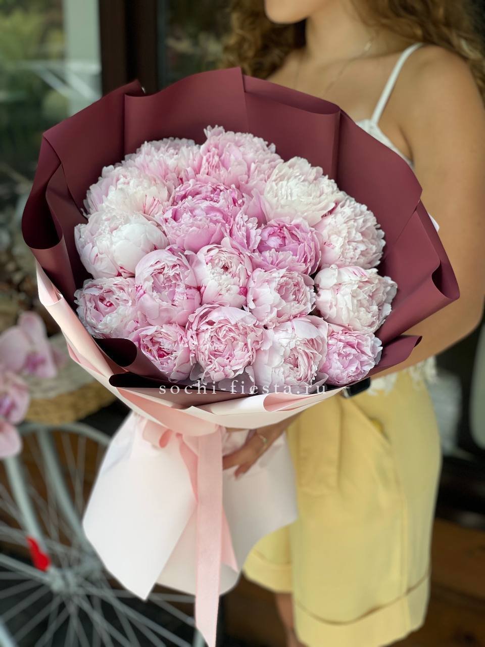 Махровые пионы Сара Бернар раскрываются широкими шапками с множеством лепестков. Комбинированное оформление поддерживает пышную форму букета и его выразительность.