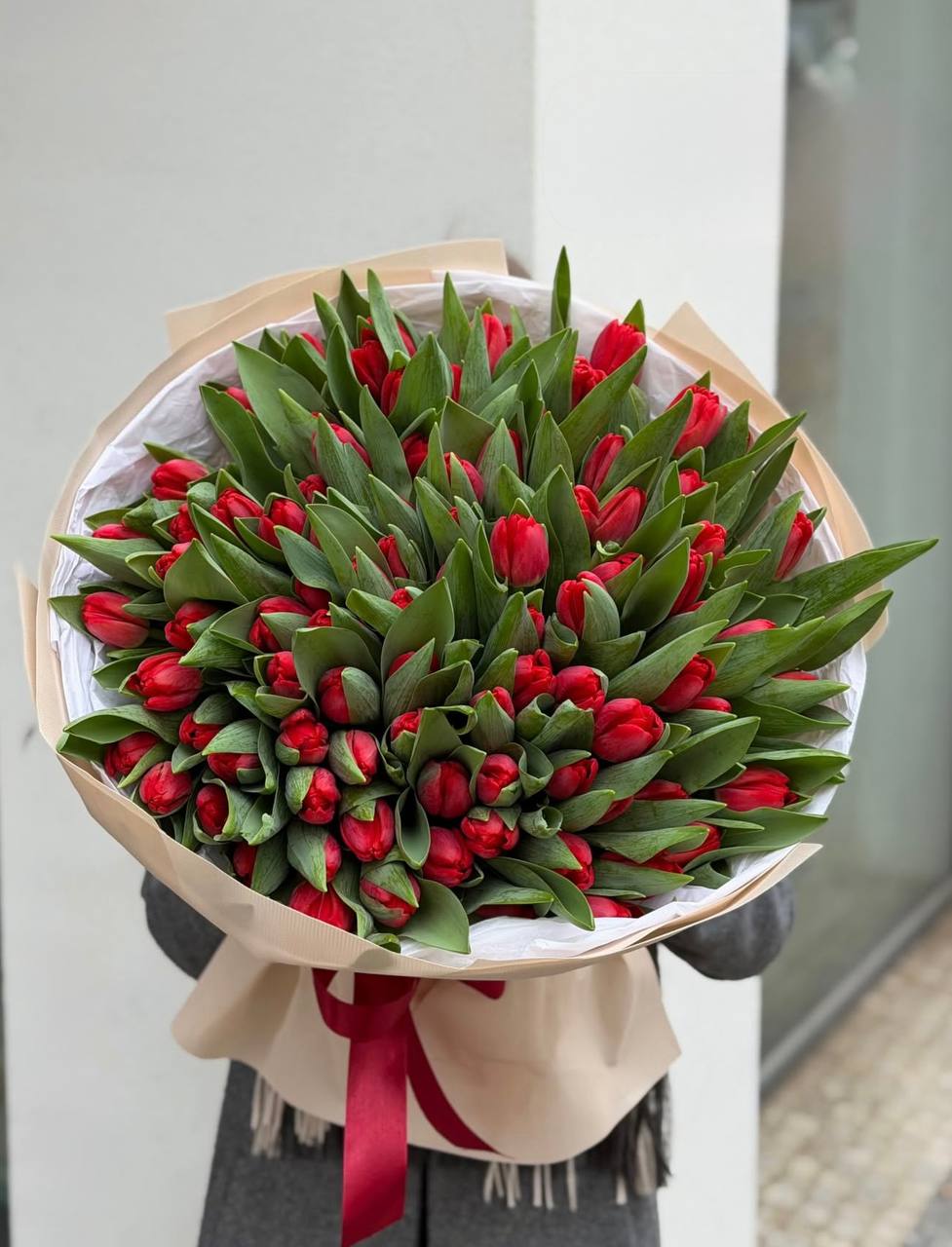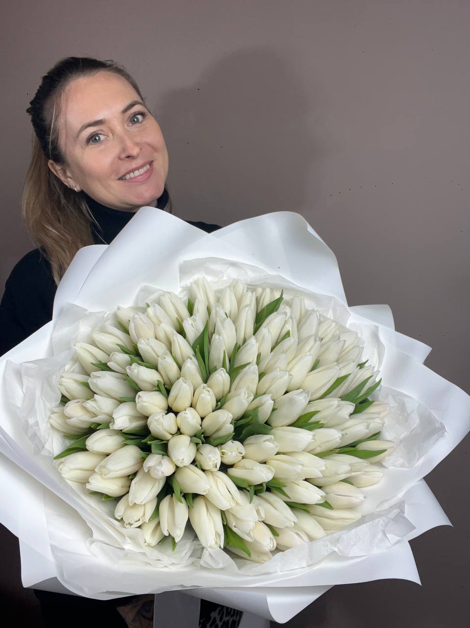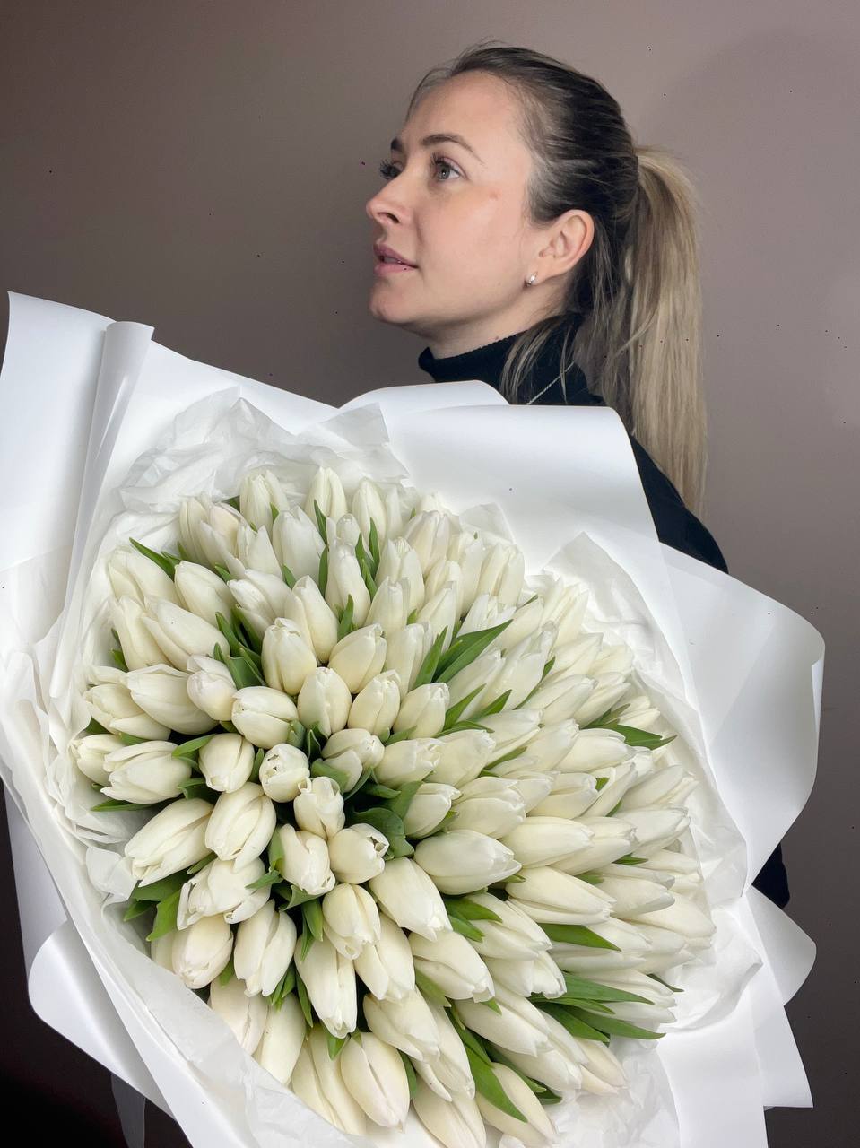 Пятьдесят один тюльпан собраны в плотную округлую форму. Белые бутоны создают объёмное облако с чёткими краями. Монохромная композиция заполняет пространство спокойной энергией.