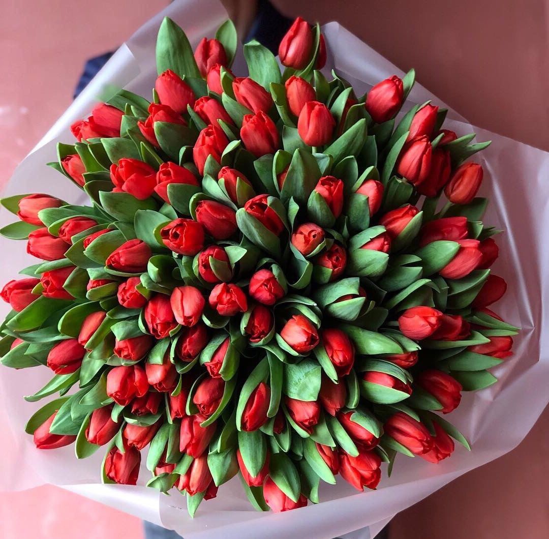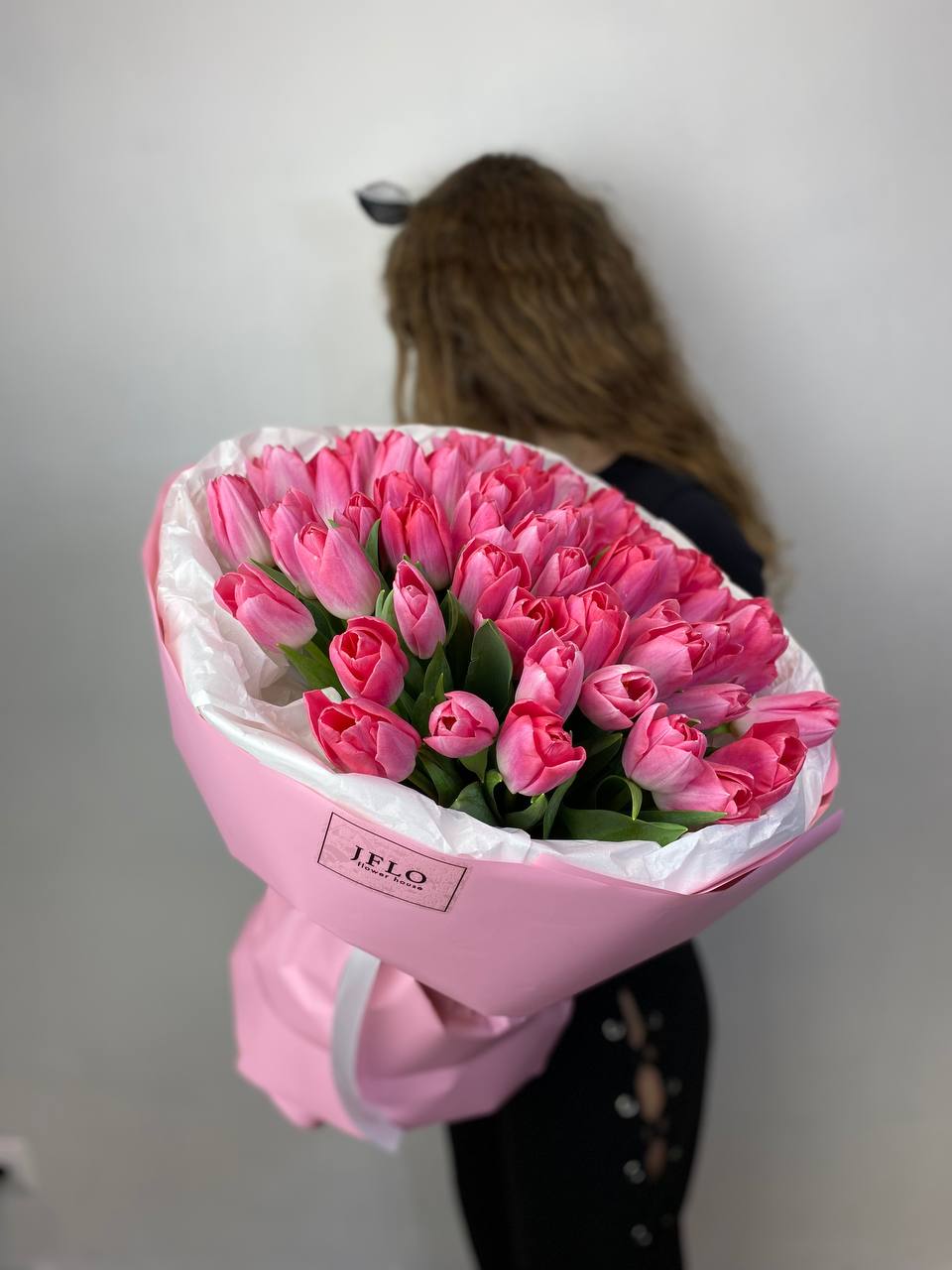 Состав букета: 39 тюльпанов, амарантус (аналог),  лента, упаковка.