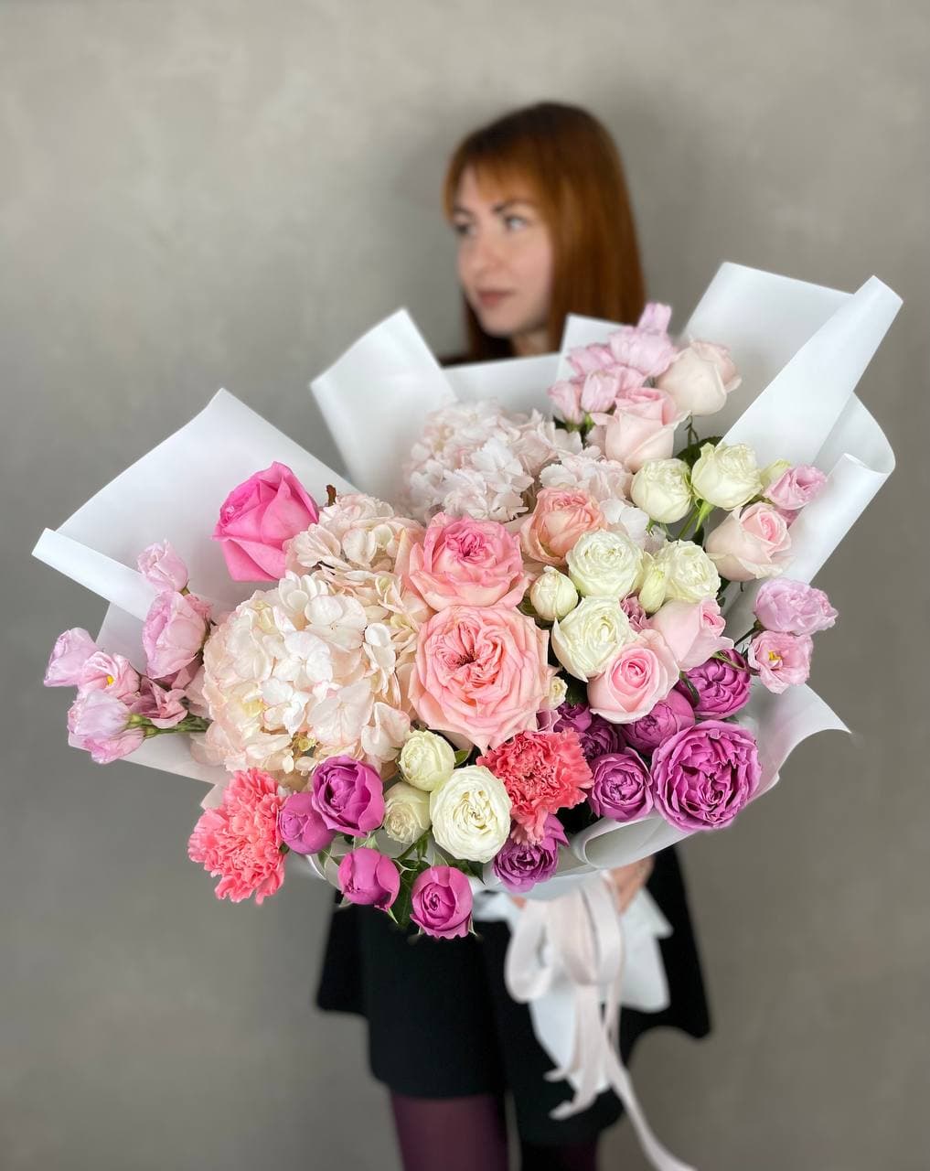 Плавные линии пышных соцветий гортензии переходят в округлые формы пионовидных роз и воздушные бутоны эустомы. Диантусы добавляют графичности, а дизайнерское оформление задает общий ритм композиции. Букет для пространств с характером.