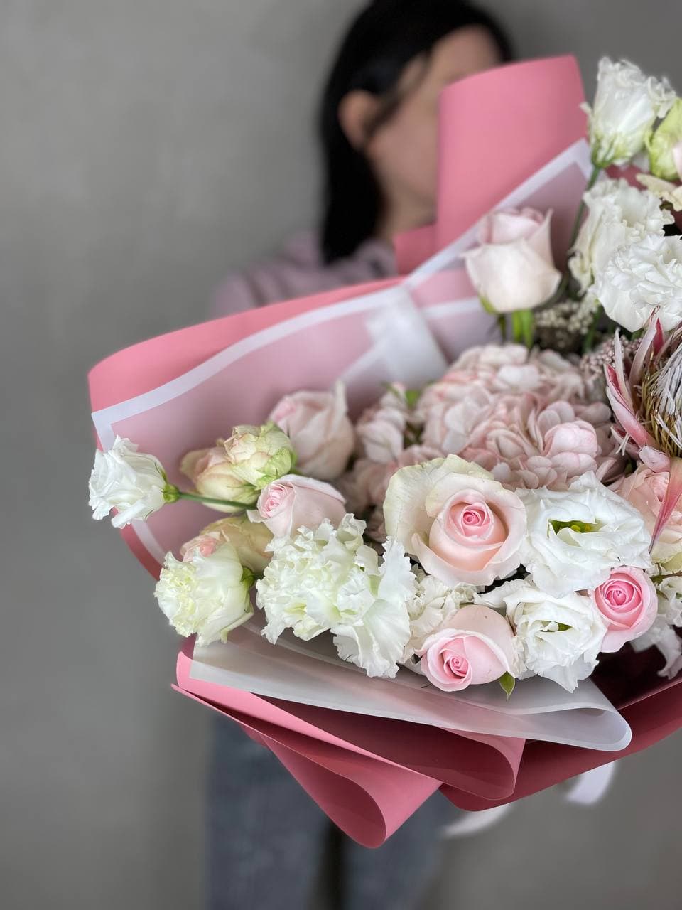 Протея задает графичный акцент, а пушистые шапки гортензии создают объем и глубину. Пионовидные розы и эустома дополняют композицию мягкими переходами, озотамнус добавляет воздушность.