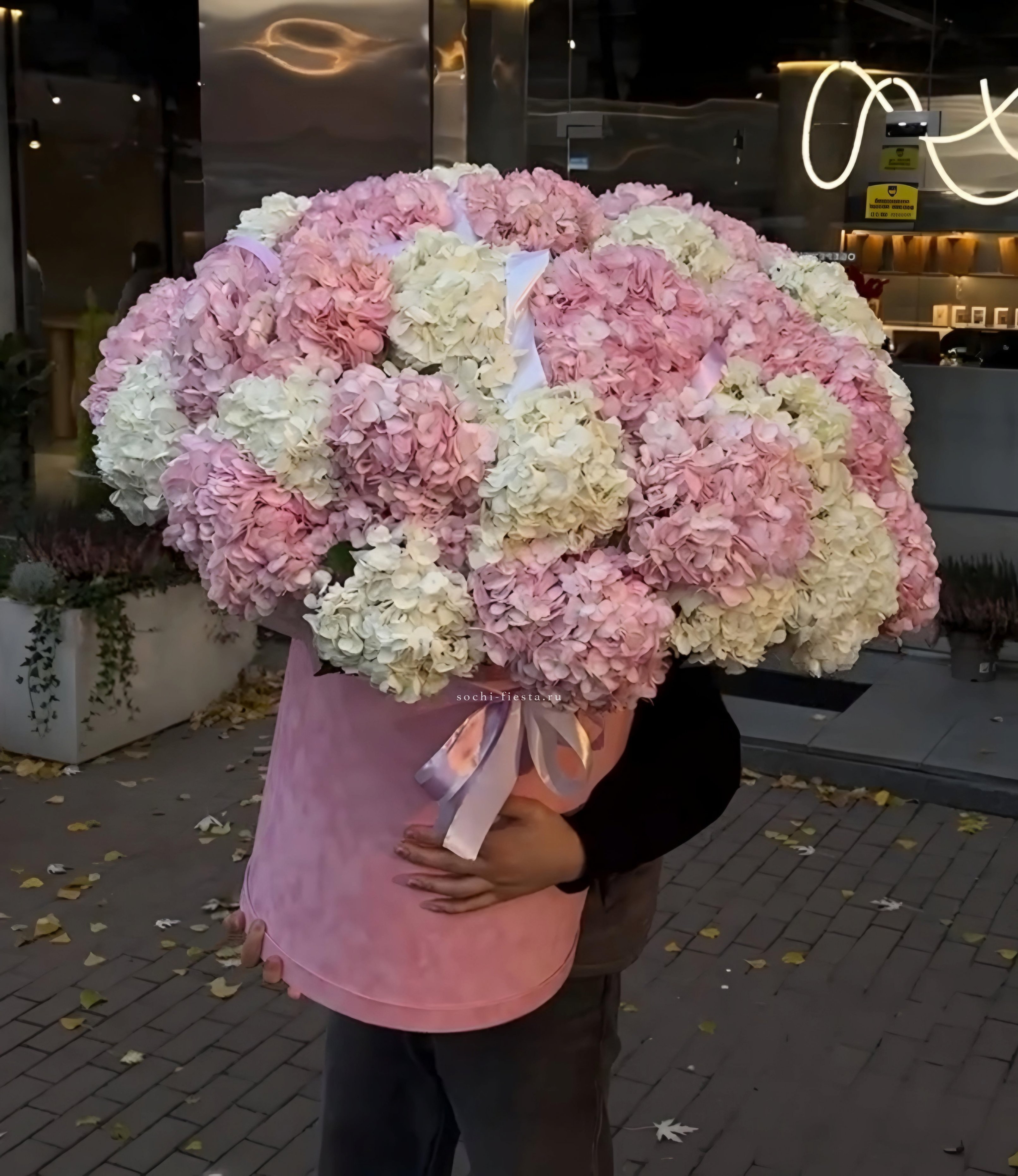 Крупные соцветия гортензий плотно собраны в бархатном цилиндре и создают впечатляющее присутствие в пространстве. Монокомпозиция работает как самостоятельный акцент в интерьере.