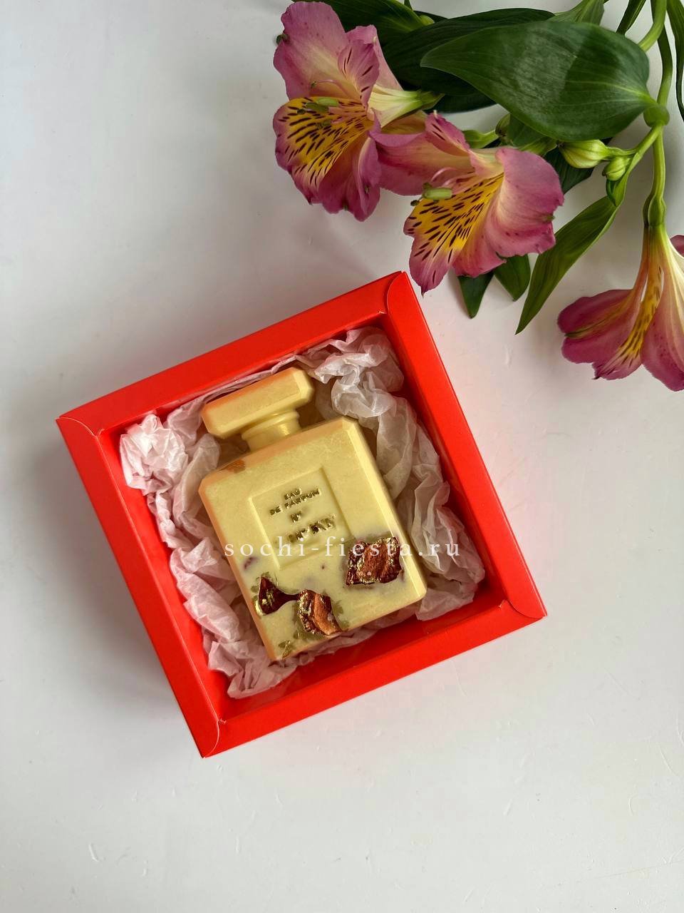Белый бельгийский шоколад с золотистыми тыквенными семенами и яркими осколками клубники. Десерт в форме аромафлакона со съедобной крышкой и рельефным узором.