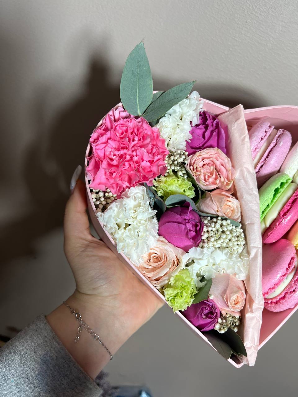 мисти баблс, бомбастик, эустома, эвкалипт, озатамус, макаронс, сердце коробочка.