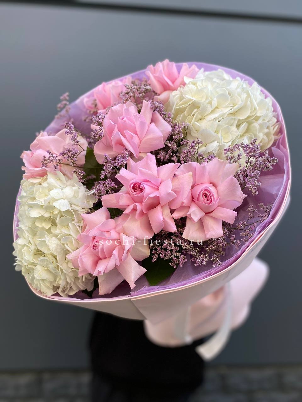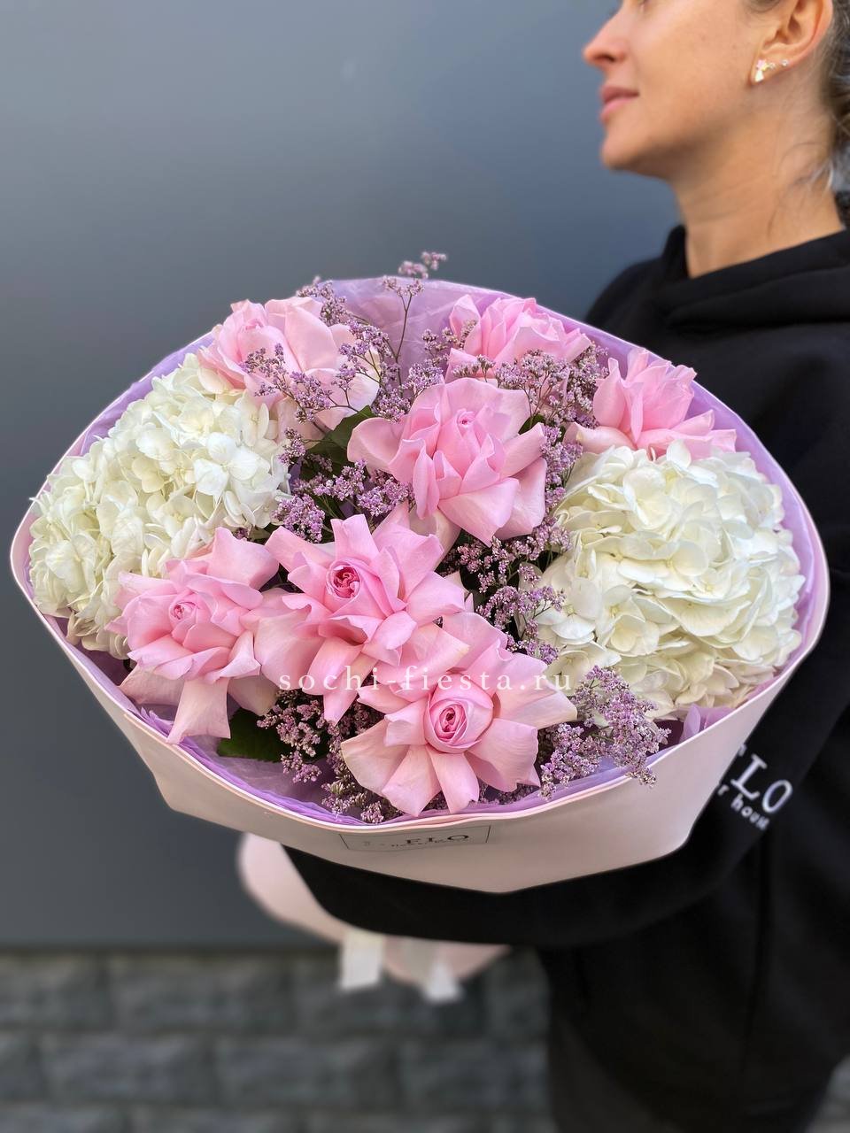 гортензия розовая, лента, дизайнерская упаковка. Цвет гортензий может незначительно отличаться.