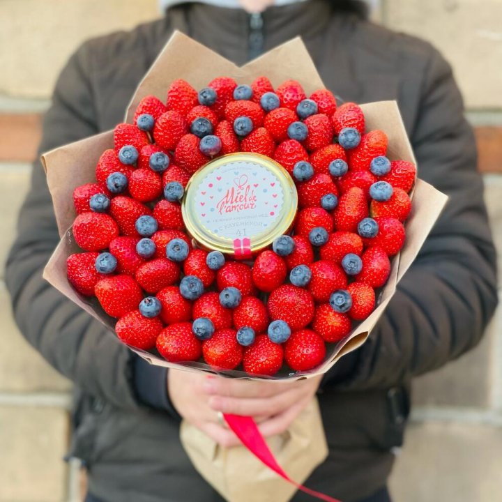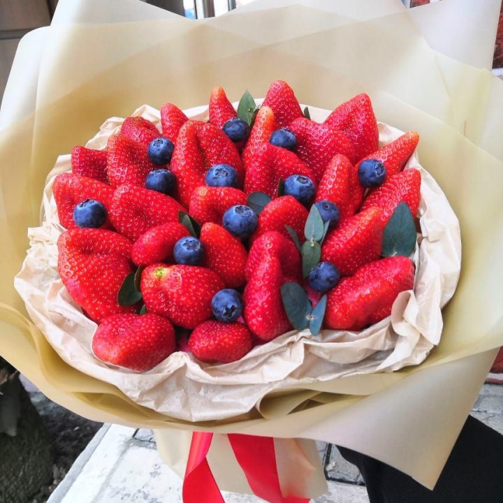 - Ягодный букет — клубника на шпажках в форме букета с живыми цветами.