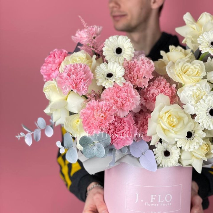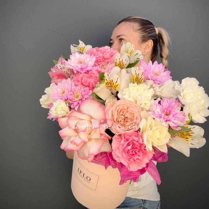Наполнение подбирается под сезон. Зимой — амариллис, розы, ранункулюсы. Весной — тюльпаны, ранункулюсы, фрезия. Летом — пионы в мае-июне, гортензия в июле-августе. Осенью — хризантемы и декоративные травы.