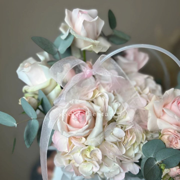 Наполнение подбирается под сезон. Зимой — амариллис, розы, ранункулюсы. Весной — тюльпаны, ранункулюсы, фрезия. Летом — пионы в мае-июне, гортензия в июле-августе. Осенью — хризантемы и декоративные травы.