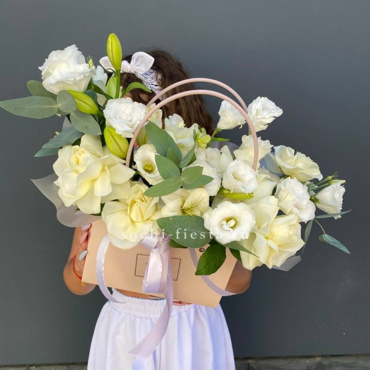 Коробка в студии Кургане — плотный картон с матовой поверхностью, иногда с тиснением логотипа. Внутри — флористическая губка (оазис), предварительно пропитанная водой. Сверху — атласная или шёлковая лента, декоративная тесьма, иногда фирменная открытка.