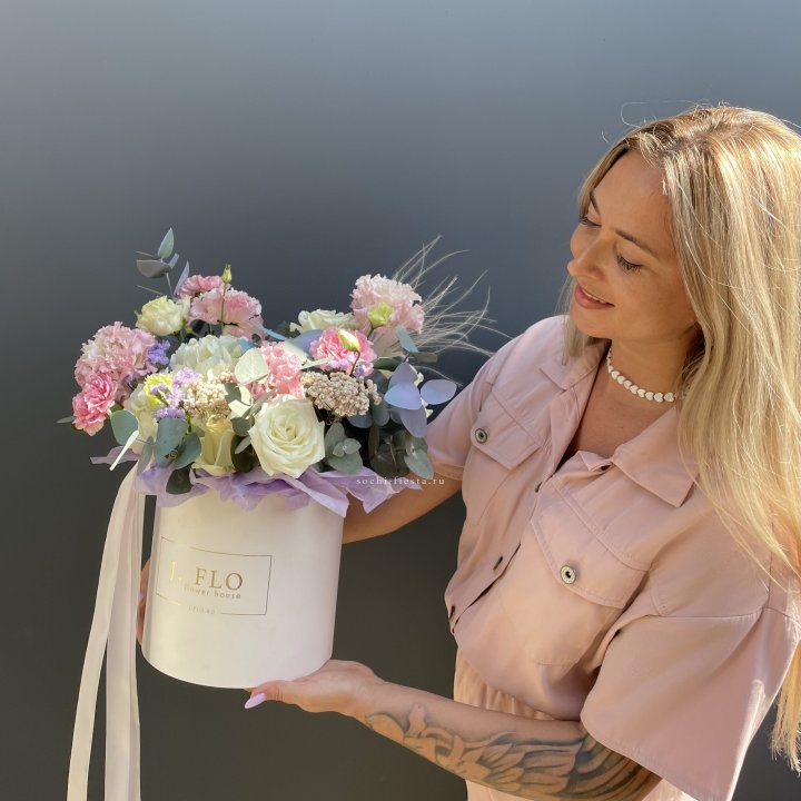 шляпная коробка с розами и хризантемами для студии флористики в Кургане