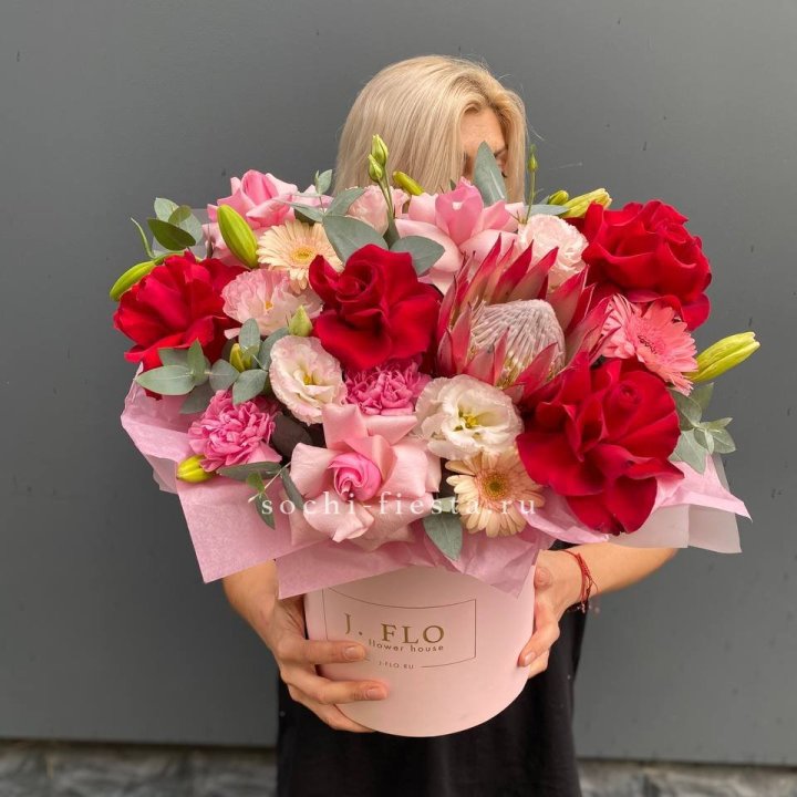 Наполнение подбирается под сезон. Зимой — амариллис, розы, ранункулюсы. Весной — тюльпаны, ранункулюсы, фрезия. Летом — пионы в мае-июне, гортензия в июле-августе. Осенью — хризантемы и декоративные травы.