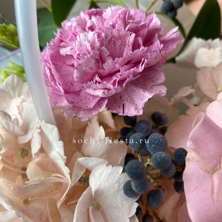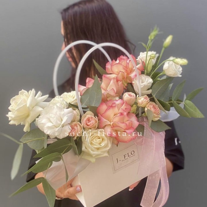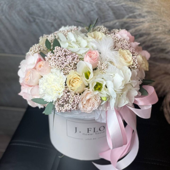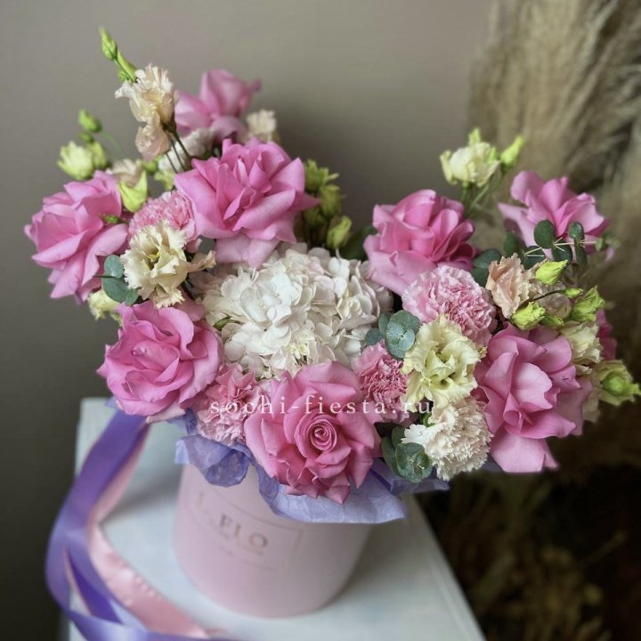 Наполнение подбирается под сезон. Зимой — амариллис, розы, ранункулюсы. Весной — тюльпаны, ранункулюсы, фрезия. Летом — пионы в мае-июне, гортензия в июле-августе. Осенью — хризантемы и декоративные травы.