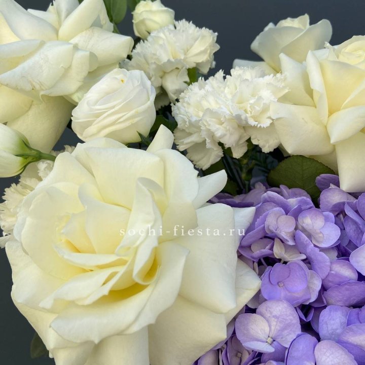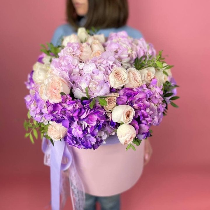 Наполнение подбирается под сезон. Зимой — амариллис, розы, ранункулюсы. Весной — тюльпаны, ранункулюсы, фрезия. Летом — пионы в мае-июне, гортензия в июле-августе. Осенью — хризантемы и декоративные травы.