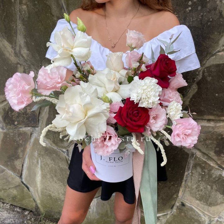 шляпная коробка с розами и хризантемами для студии флористики в Кургане