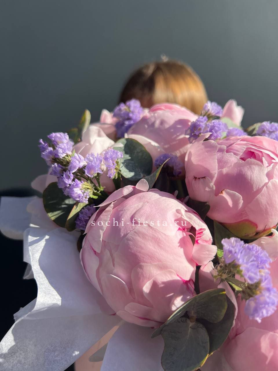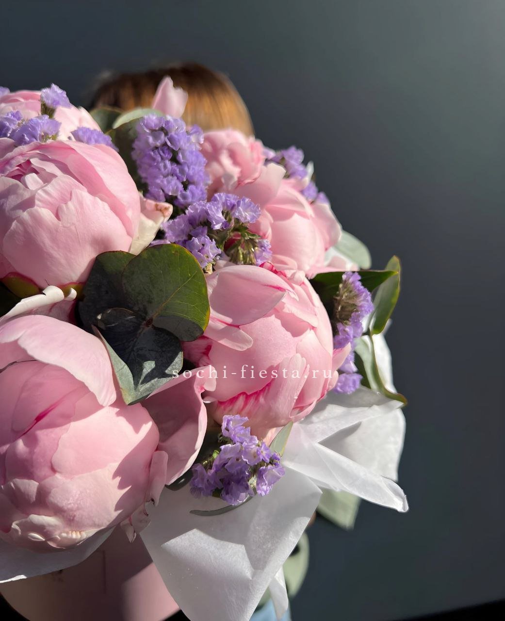 Пионы сочетаются с фиолетовыми соцветиями лаванды или статицы в цилиндре. Лавандовые оттенки создают прохладную гамму и освежают восприятие композиции.