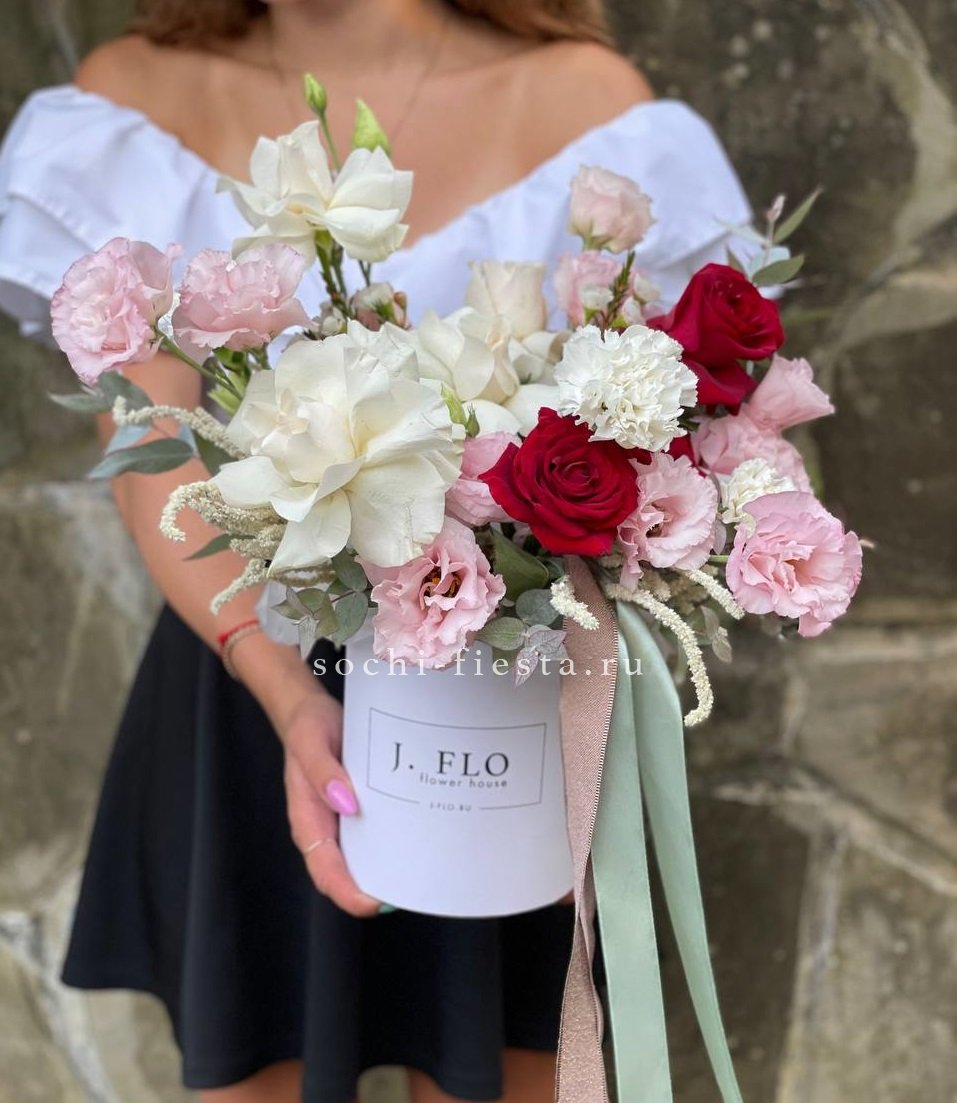 Компактная композиция в круглой коробке собрана из пышных бутонов и воздушной зелени. Roses сочетаются с многолепестковой эустомой и яркими диантусами, создавая объёмную текстуру. Подойдёт для небольших пространств и камерных поводов.