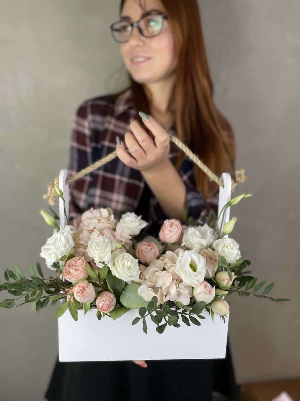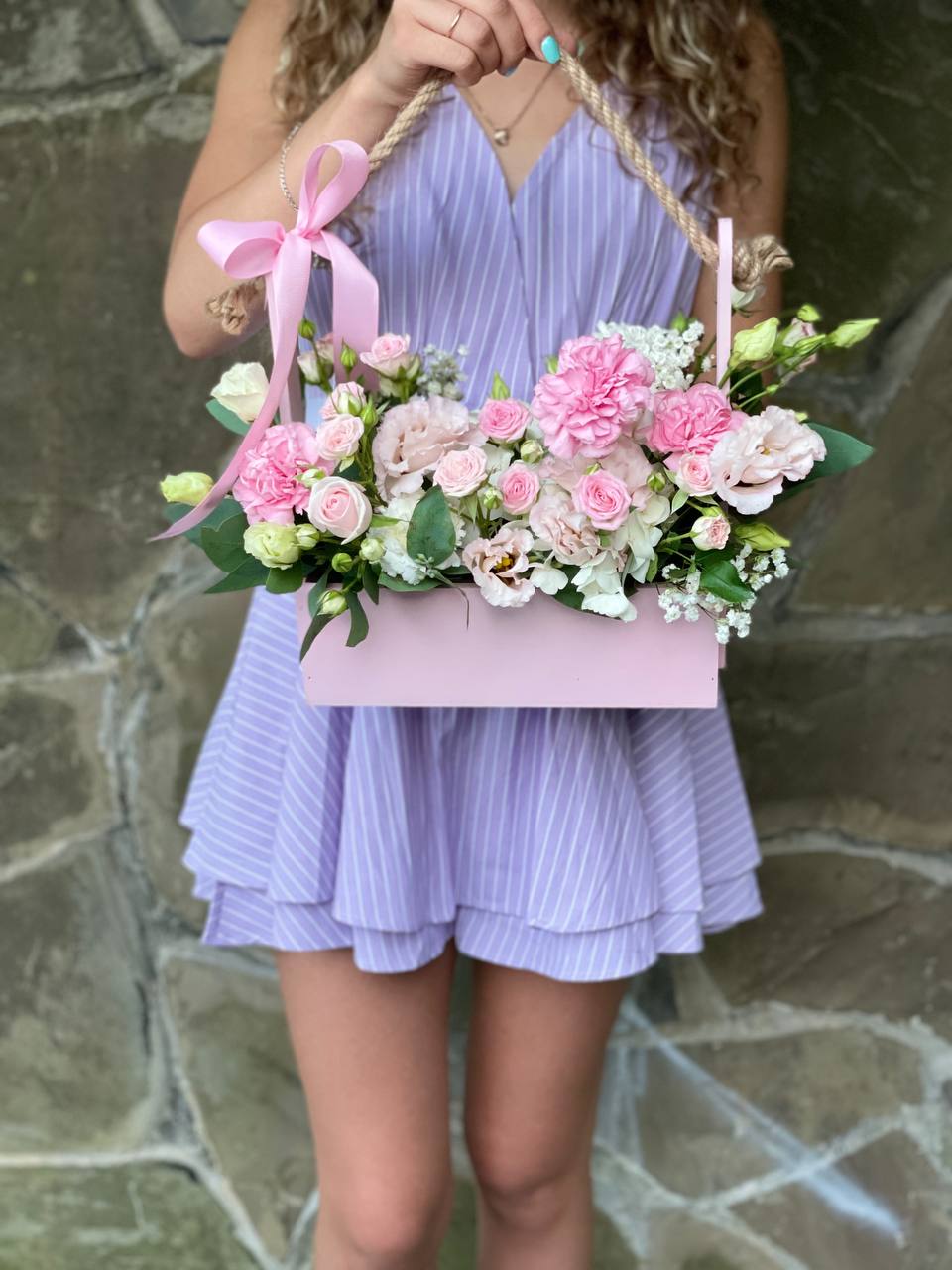 Композиция в деревянном ящике сочетает воздушную эустому с плотными головками роз и мелкими соцветиями диантуса. Фисташковый эвкалипт создает мягкую зеленую рамку вокруг цветочного наполнения.