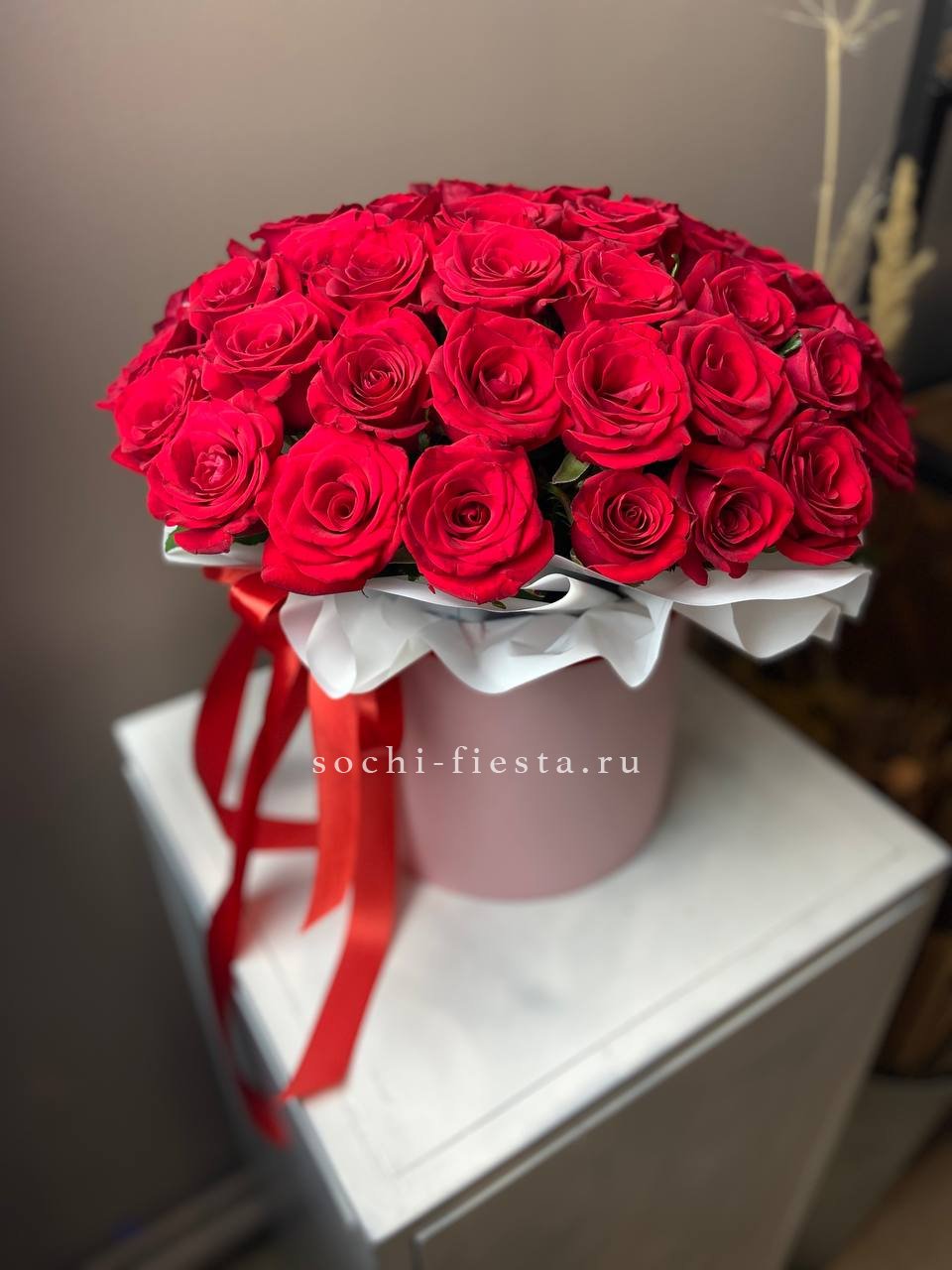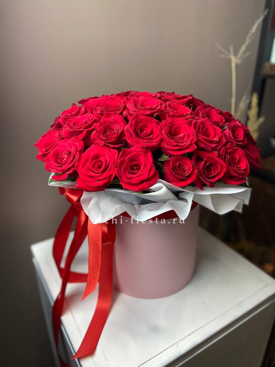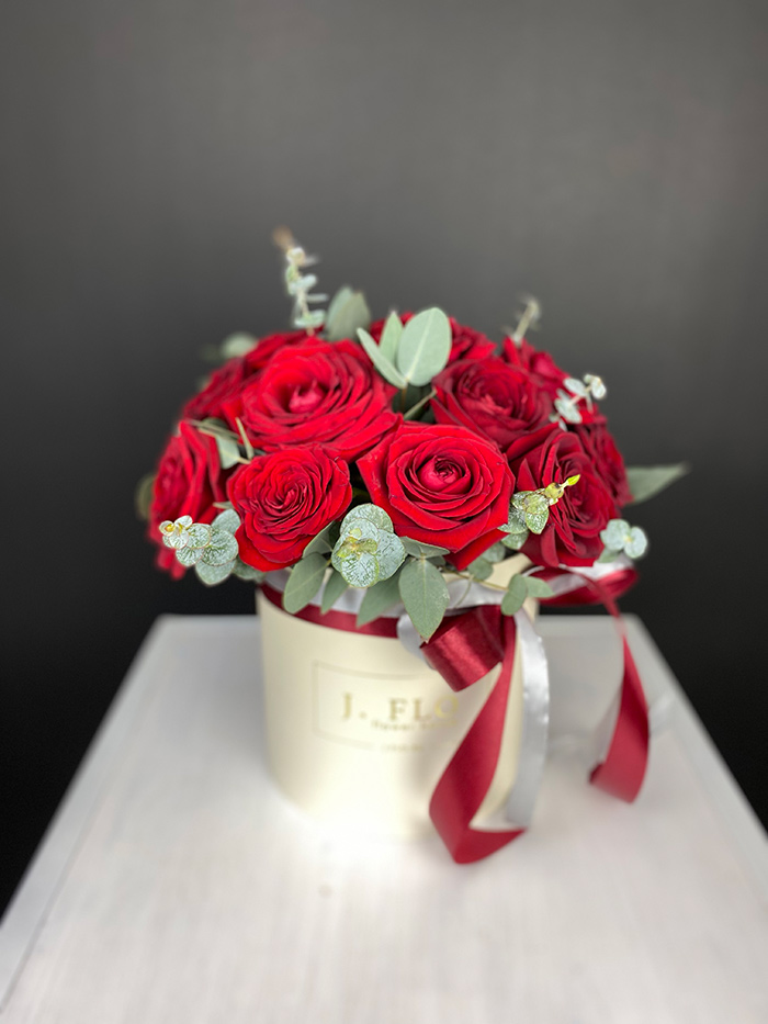 Двадцать пять вывернутых французских роз наполняют белый цилиндр графичной структурой. Бутоны раскрыты плотно, лепестки образуют многослойную текстуру с мягкими изгибами и глубиной.
