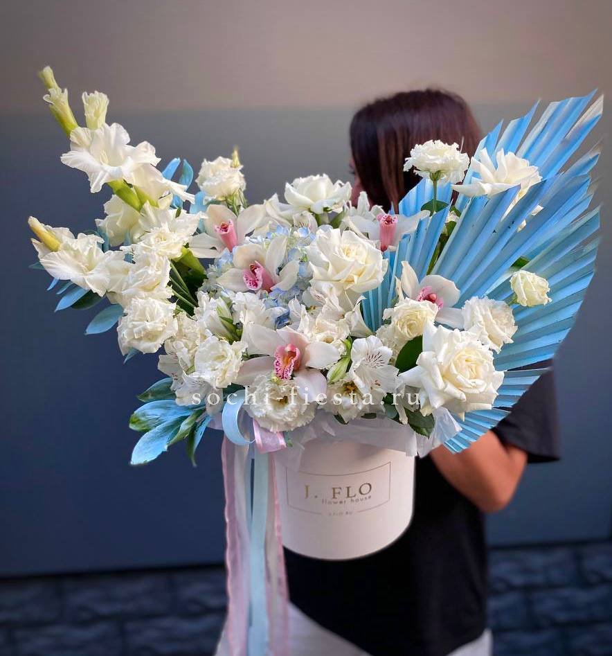 Белоснежные розы и орхидеи встречаются с синими оттенками гортензии, создавая свежую палитру. Гладиолусы задают вертикальный ритм, а альстромерии наполняют композицию деталями.