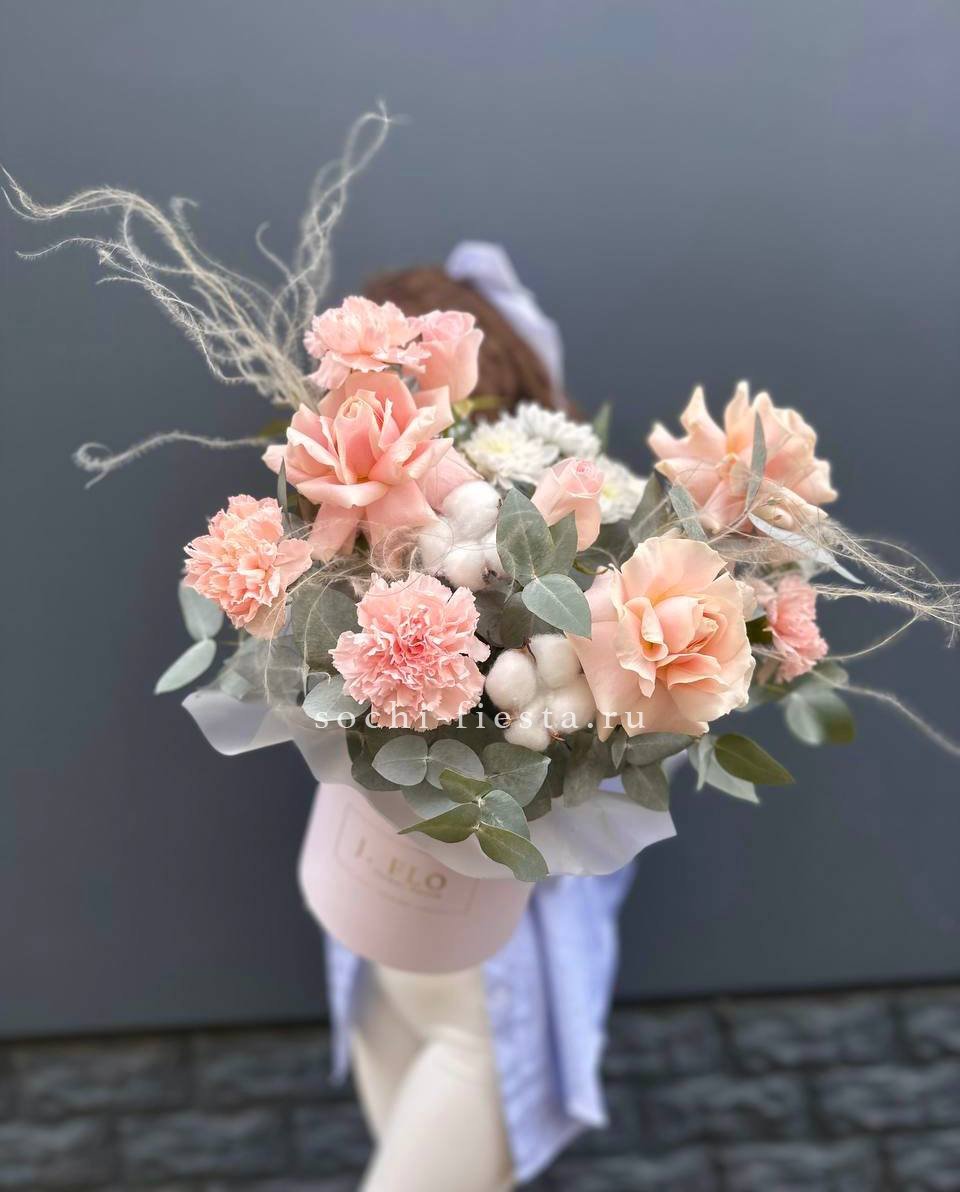 Розовые розы окружены кустовыми хризантемами и фактурным диантусом. Хлопок вносит графичность, а эвкалипт обрамляет композицию свежей зеленью.