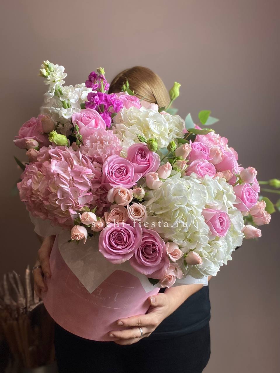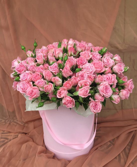 цветочная композиция в розово-белых тонах в розовом цилиндре D20-25.