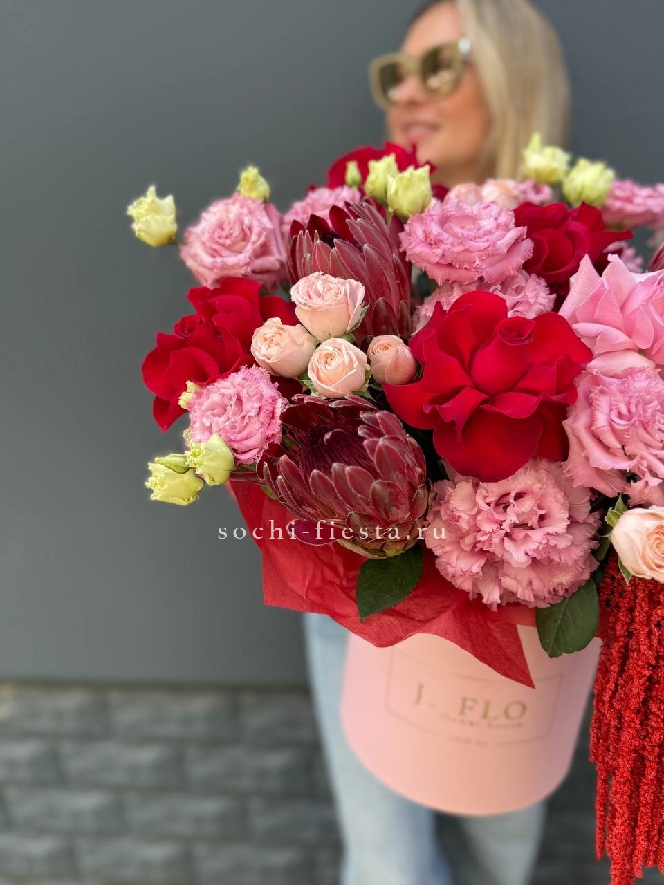 пионовидная кустовая роза, гортензия, одноголовая роза, эустома, бавардия, бокс D20.