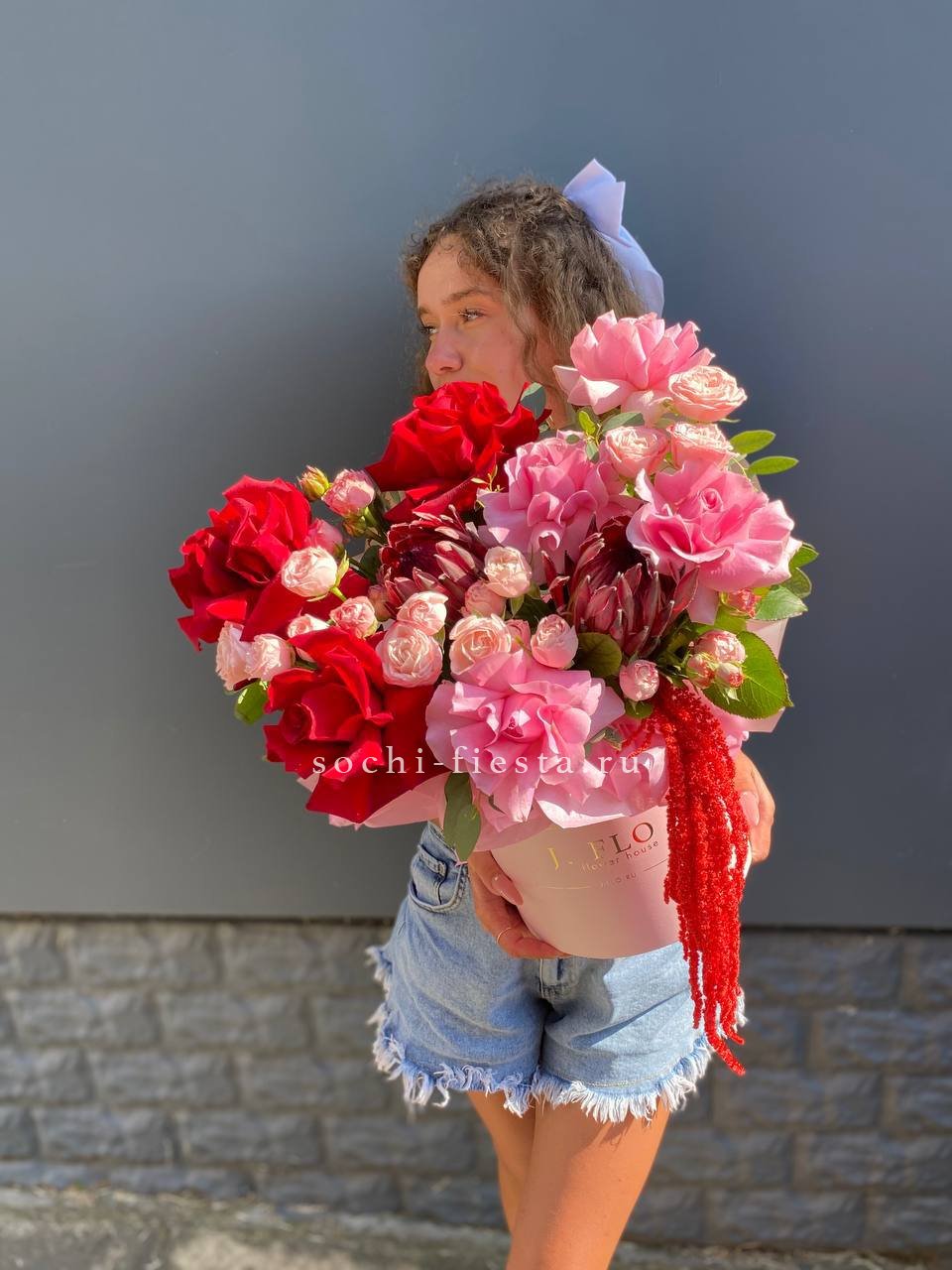 Букет выполнен в насыщенной красно-розовой гамме, создавая контрастное и выразительное сочетание, которое может символизировать сильные чувства или страсть. Это современный авторский букет, который выглядит роскошно и эффектно, подходящий для особых случаев и подарков.