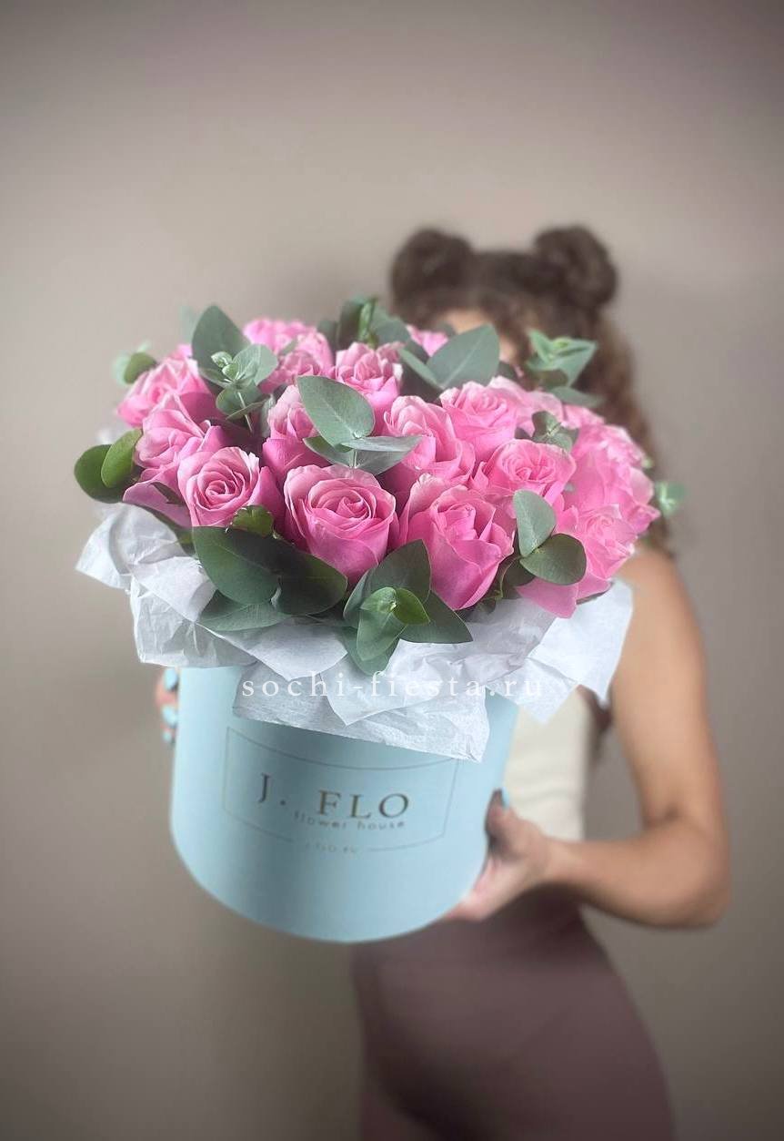 гортензии, розовые розы, маттиола (аналог), эустомы, перо, диантусы,  цилиндр D20, лента, упаковка.