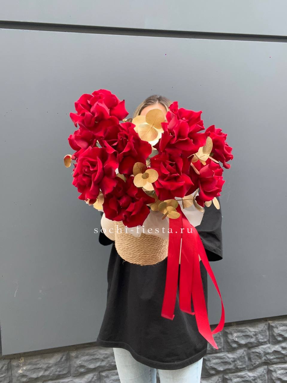 Французские розы теплого оттенка раскрываются в окружении эвкалипта и листьев Чико. Композиция в джутовом кашпо выглядит самодостаточно и гармонично вписывается в любое пространство.