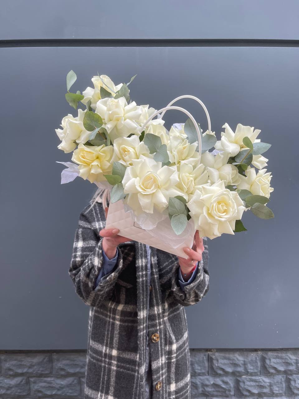 Белоснежные хризантемы и эустома создают светлое облако, которое разбавляют акценты гербер и душистой маттиолы. Композиция в сумочке готова к вручению сразу после получения.
