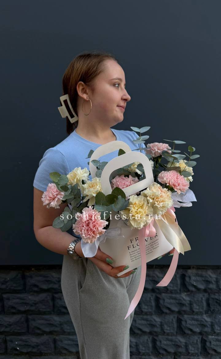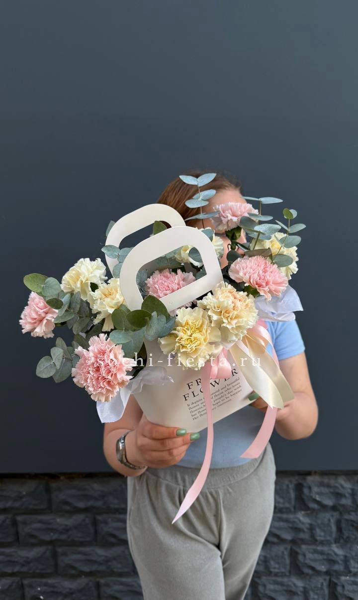 Воздушные головки диантусов собраны в компактную форму с мягкими переходами оттенков. Эвкалипт добавляет свежести и завершает композицию в удобной сумочке.