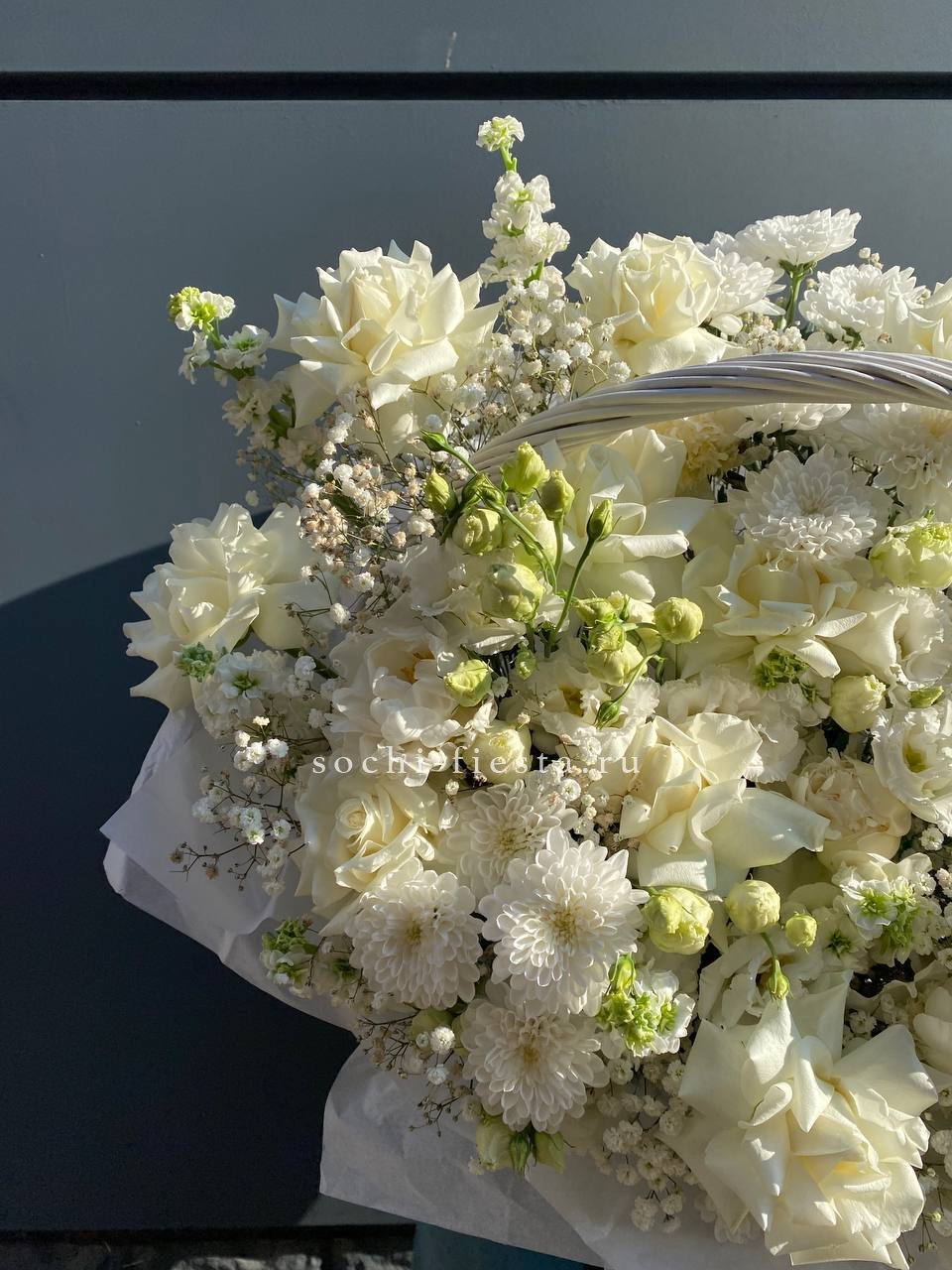 белые розы высокие в корзине.