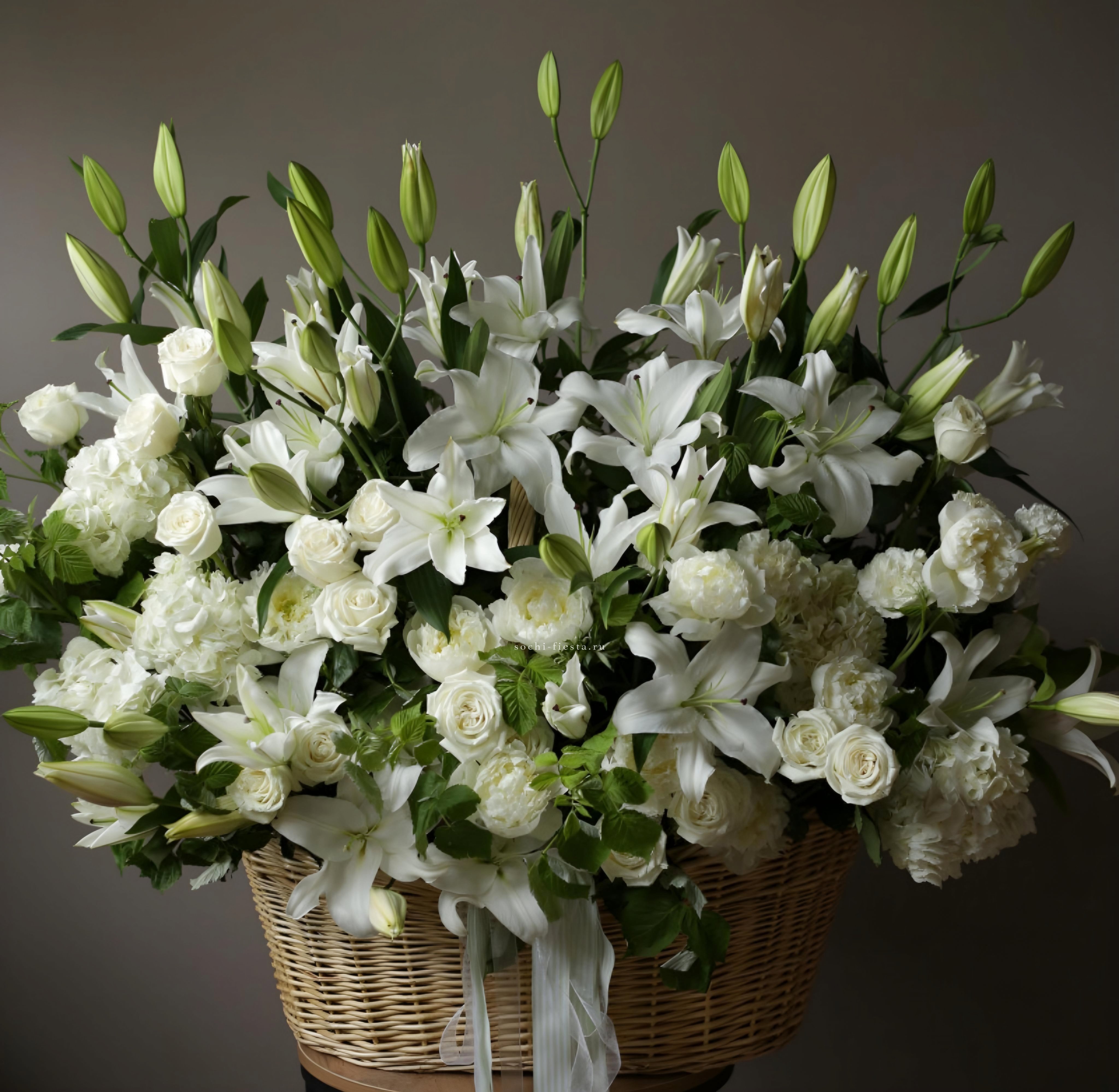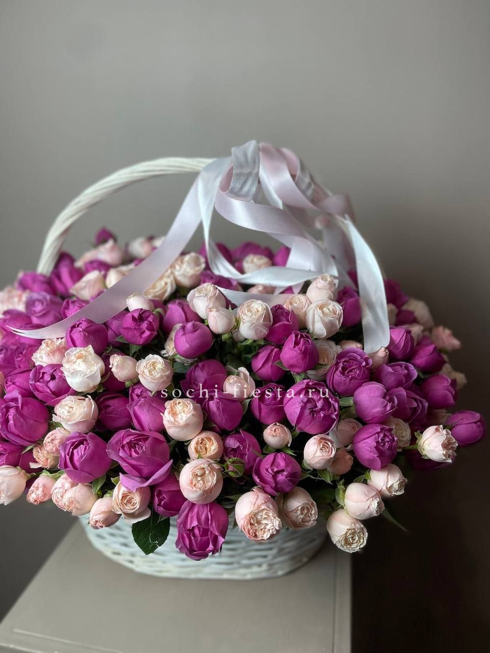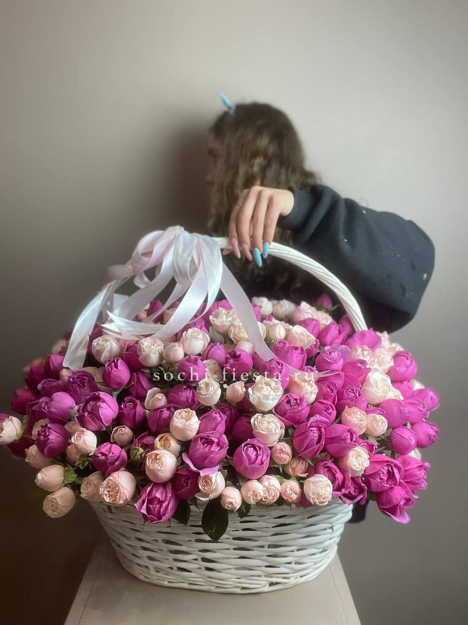 Пятьсот пятьдесят пять роз в корзине с персональной надписью — это целая инсталляция из живых цветов. Объём композиции впечатляет масштабом и создаёт незабываемое визуальное присутствие.