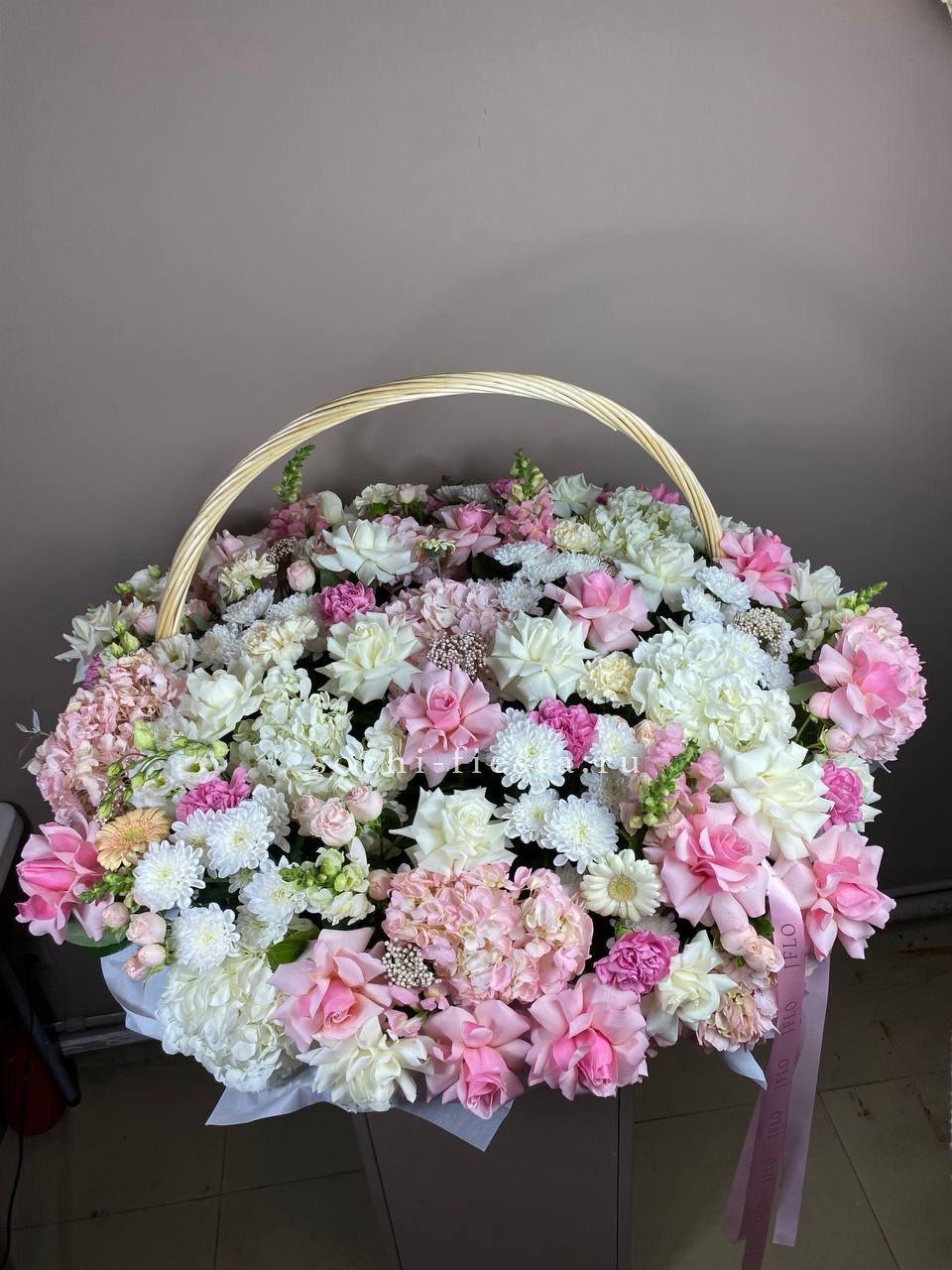 Восемь видов цветов складываются в harmonичную композицию со светлой корзиной в основе. Диантусы и эустома перекликаются с розами, а гортензия задает мягкий объем всей структуре.