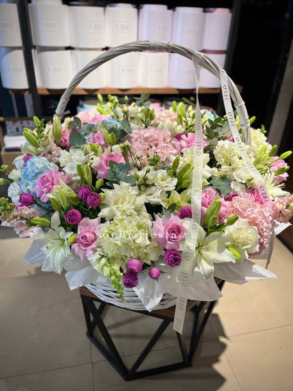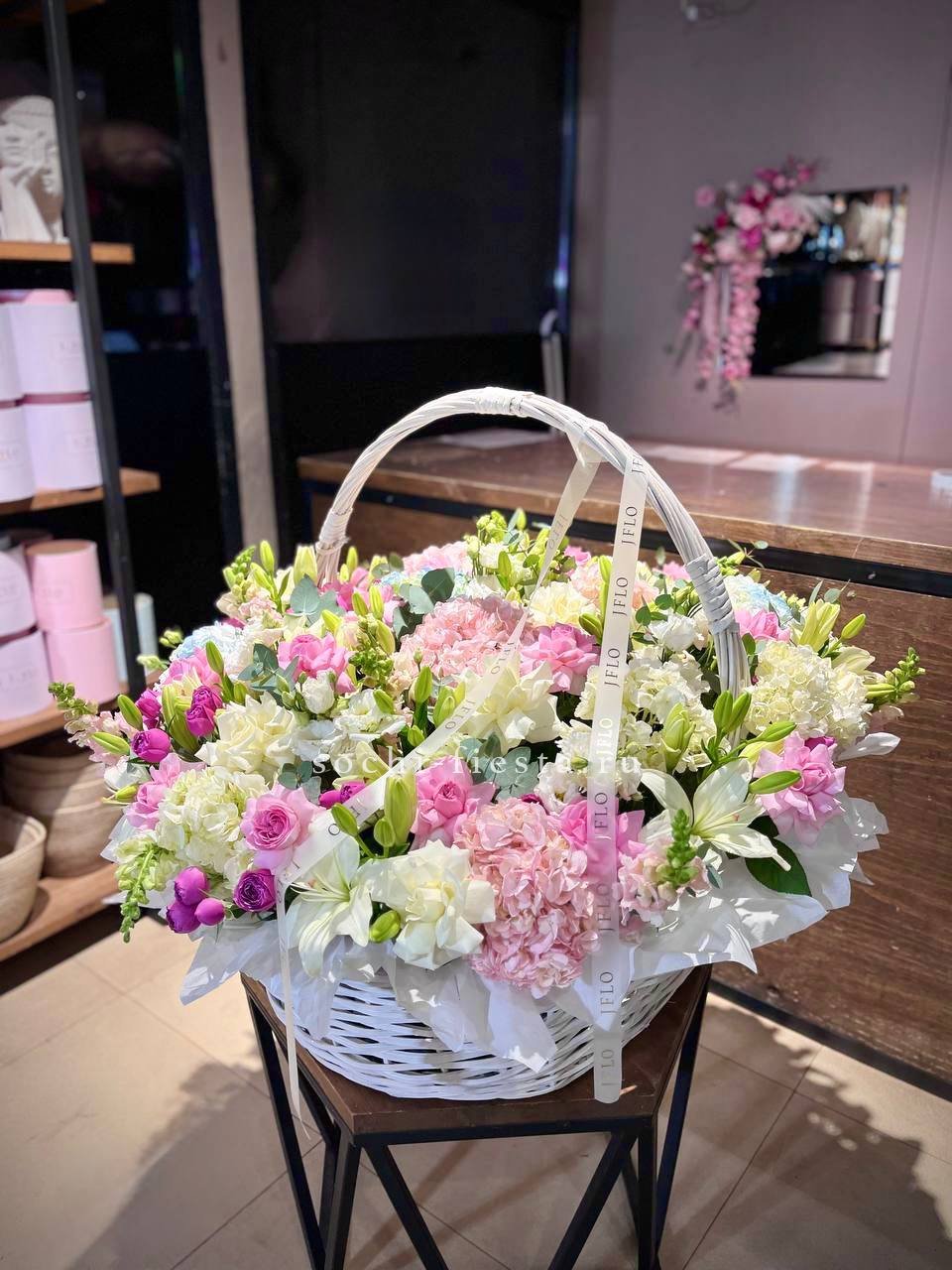 Корзина объединяет садовые розы с воздушной эустомой и яркими вспышками альстромерии. Ковыль добавляет лёгкости, а гортензия создаёт фактурный фон для всей композиции.