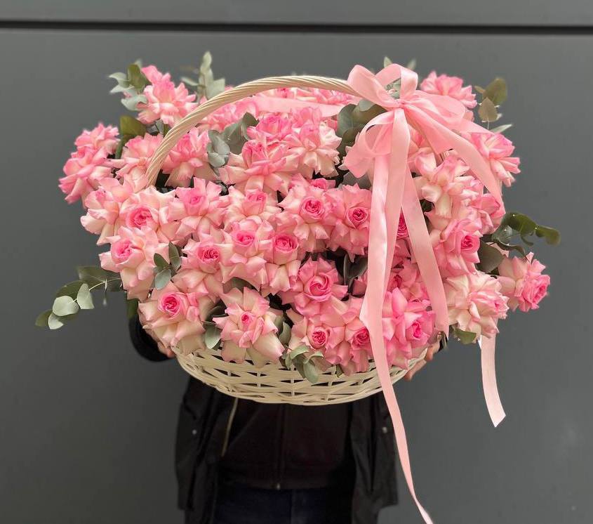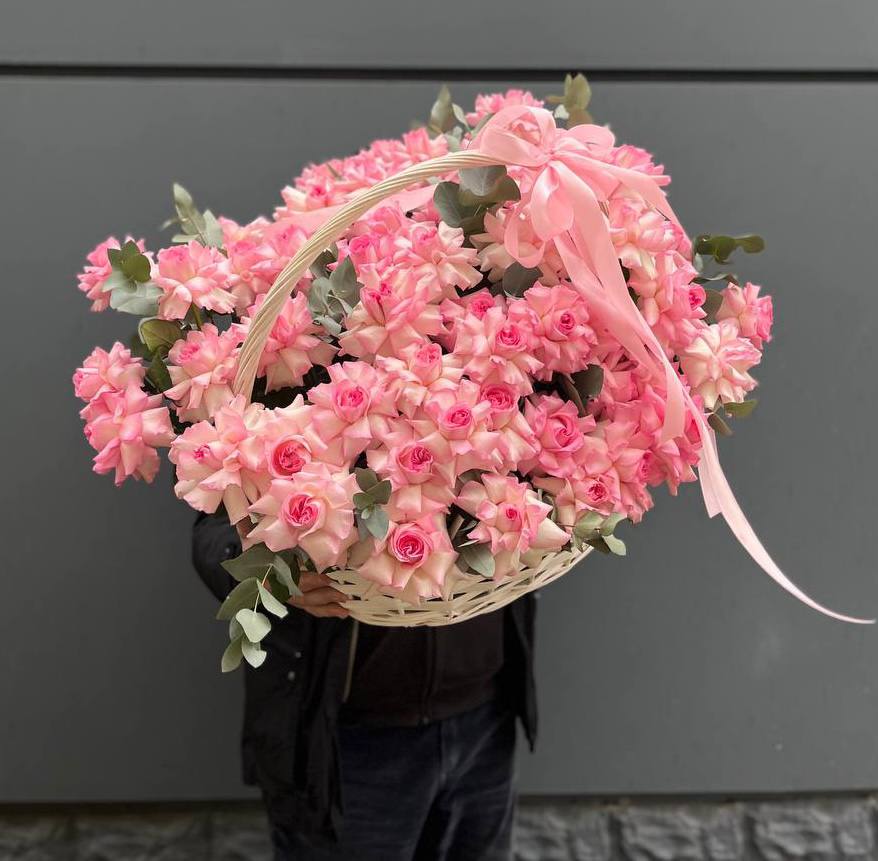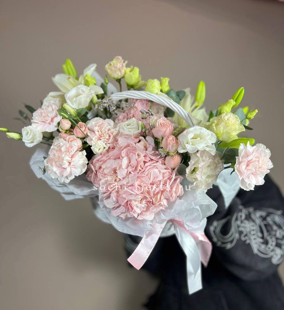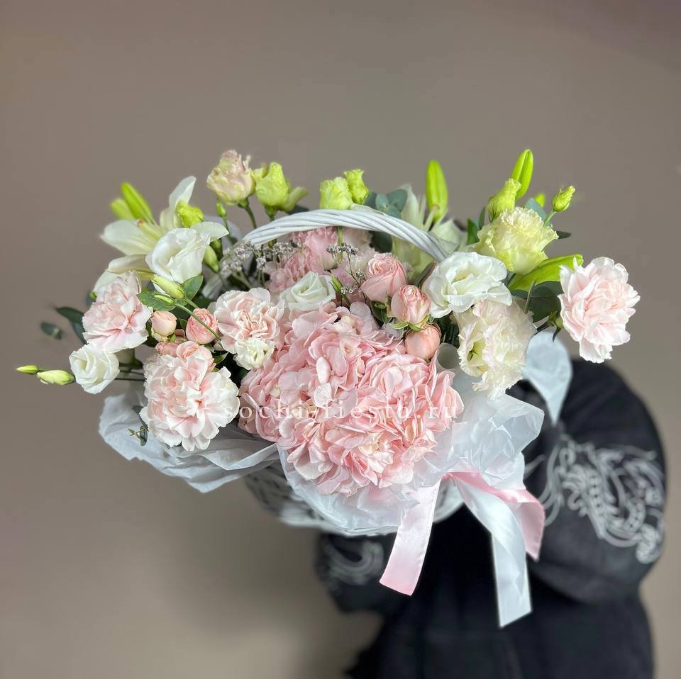Гортензия и эустома задают объём, а яркие герберы расставляют цветовые акценты по всей композиции. Диантус и хайди добавляют воздушности, эвкалипт завершает силуэт мягкими линиями. Корзина держит форму и создаёт устойчивую основу для пышной композиции.