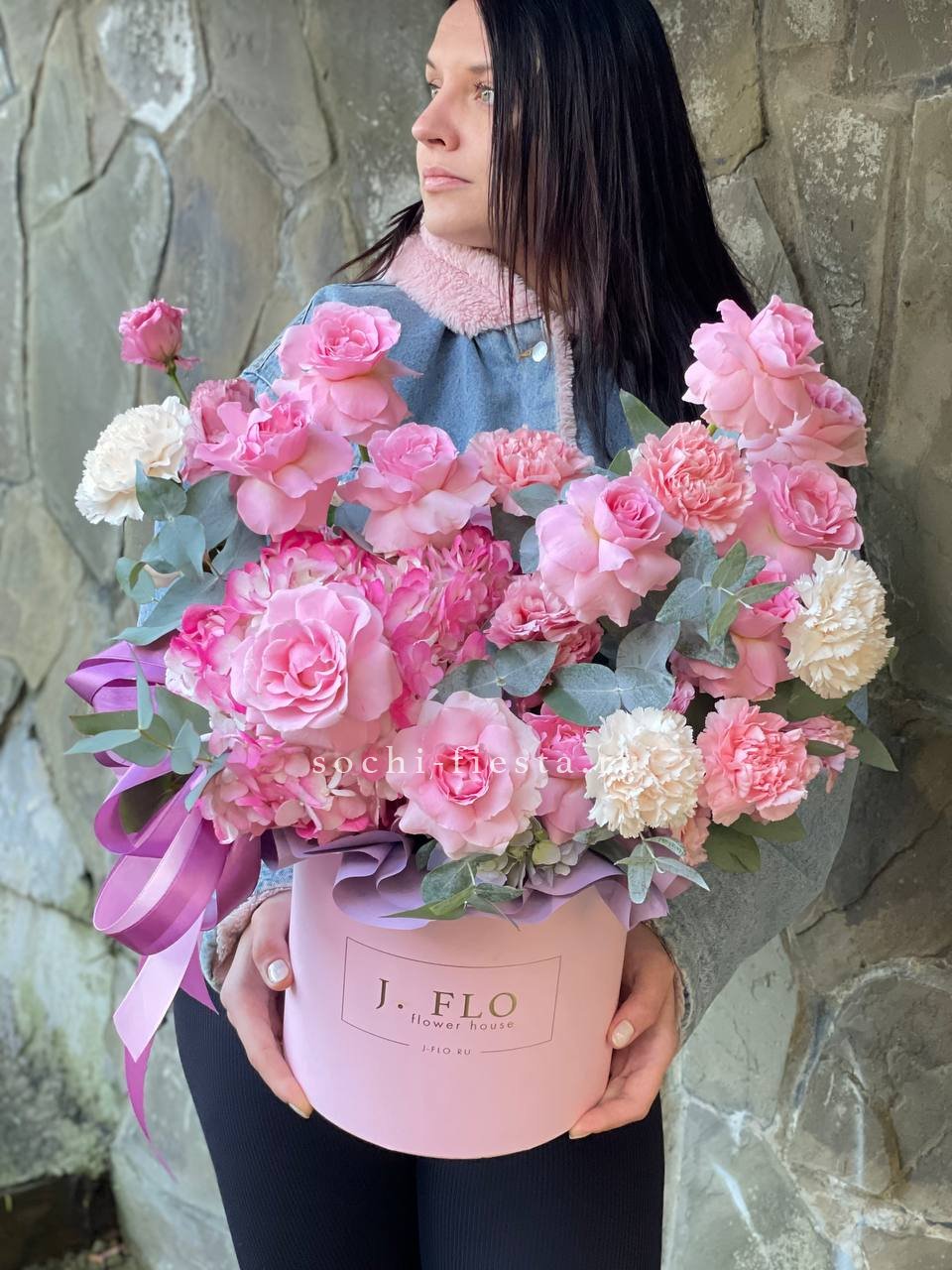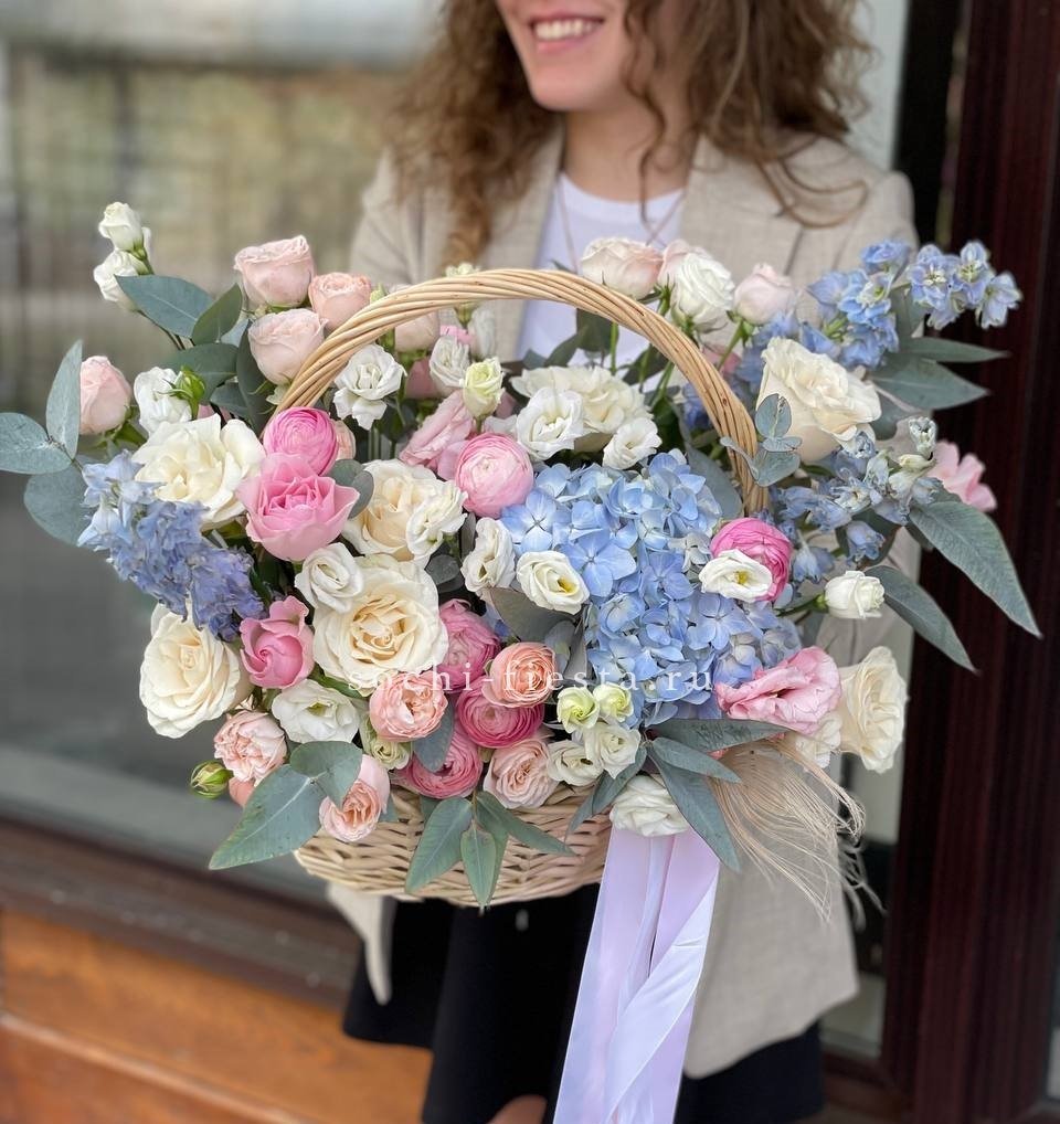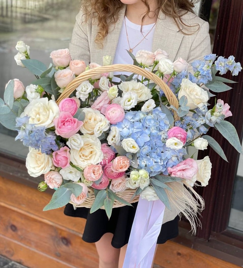 гортензия, бомбастик, эустома, розы, ранункулюсы (аналог вне сезона), дельфиниум (аналог вне сезона), лента, корзина D30.