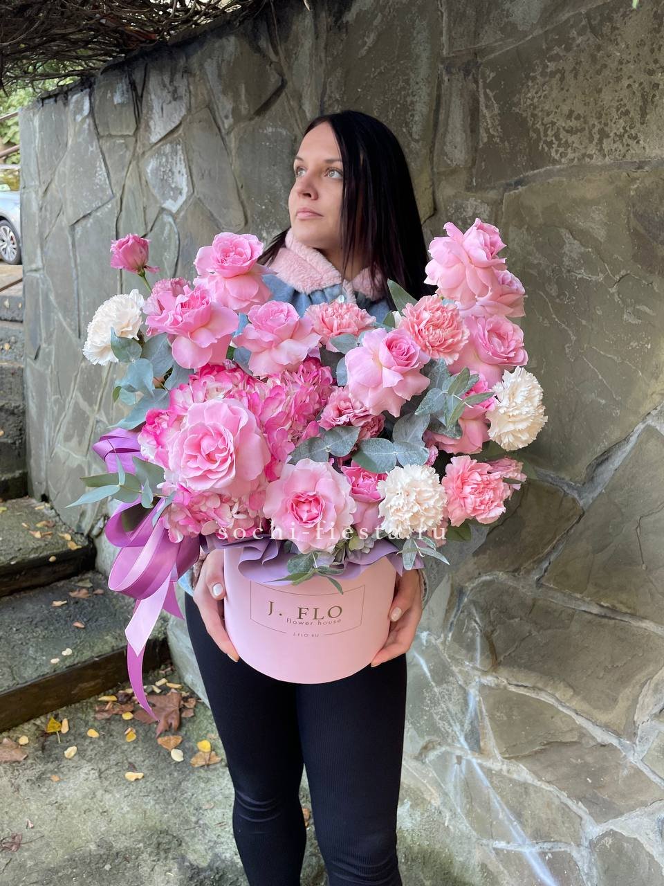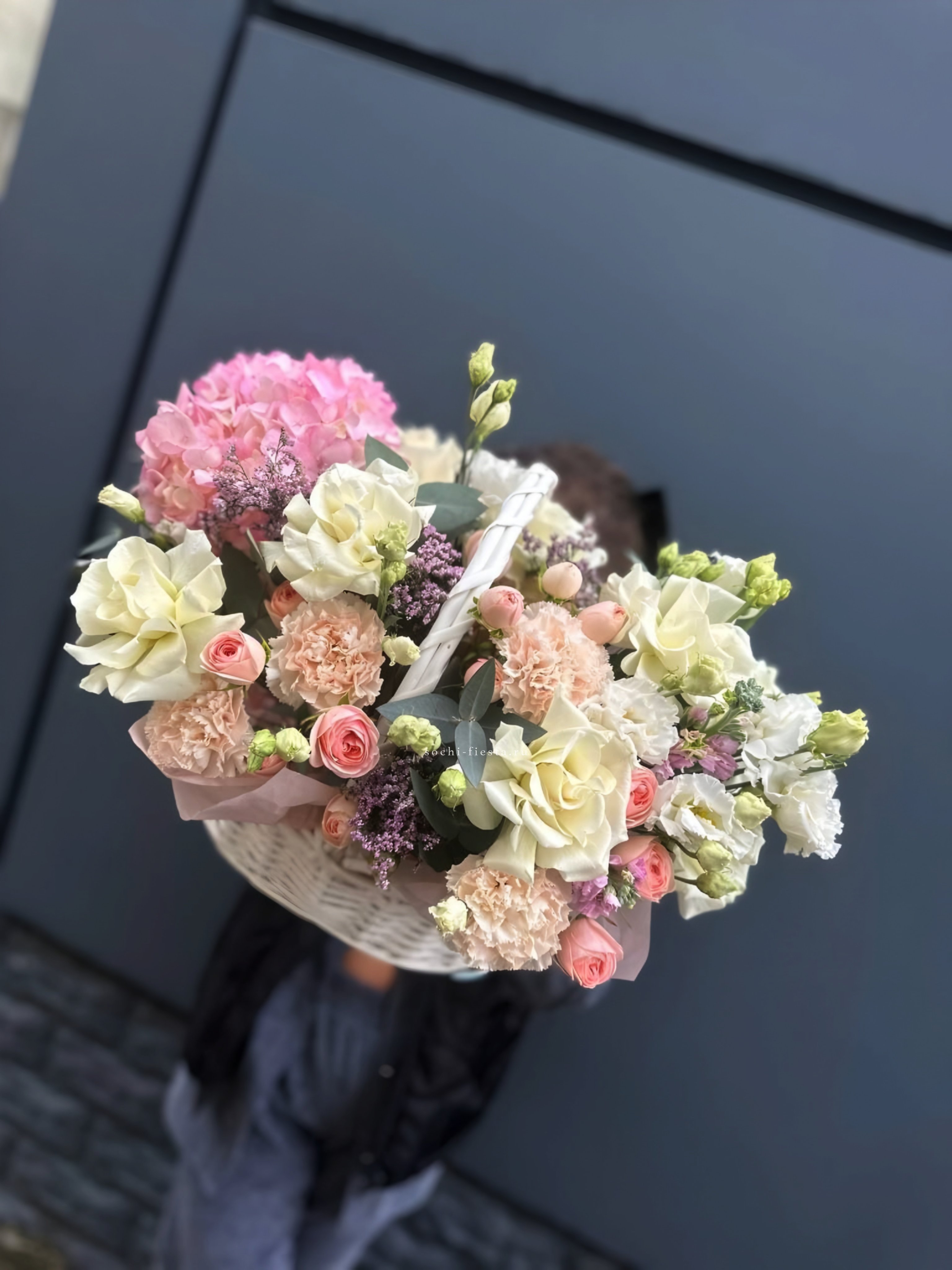 Пышная корзина с гортензией и розами дарит ощущение летнего сада прямо в руках. Бомбастик и эустома добавляют воздушности, а ранункулюсы создают яркие акценты между крупными соцветиями. Композиция собрана так, чтобы каждый цветок был виден и радовал глаз.